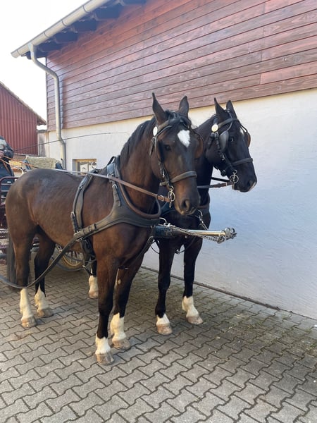 Die beiden 6-jährigen Pferde (Stockmaß ca. 165 cm) sind ein eingespieltes Team und überzeugen durch ihren ausgeglichenen, freundlichen Charakter. Sie sind sehr brav im Umgang, schmiede und verladesicher sowie absolut verkehrssicher. Bestens für das Fahren geeignet und bereits angeritten. Der Verkauf fällt uns nicht leicht und erfolgt aus gesundheitlichen Gründen. Besichtigung jederzeit nach Terminabsprache möglich.