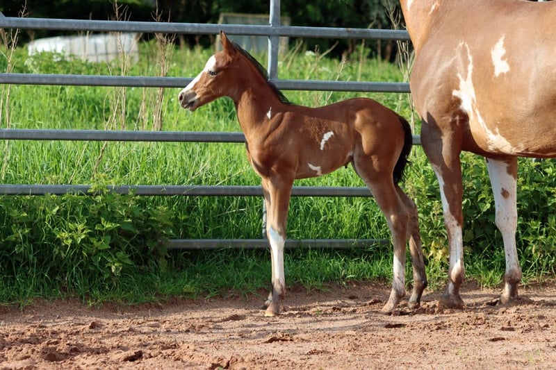 CHEYENNES JUJU PISTOL Bay frame overo Étalon APHA Né le 12.05.2024 Taille finale environ 150 cm 5 Panneau et IMM N/N Ee Aa LWO/N