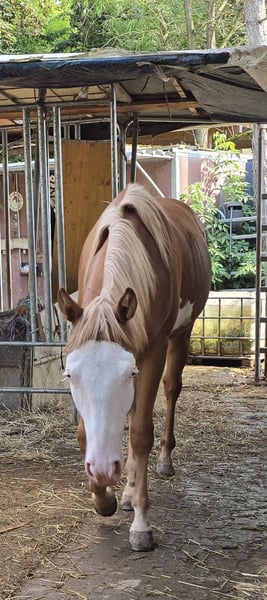 LF Masson Whiz Gun - Deze prachtige Paint Horse ruin, geboren in 2024 met een geschatte stokmaat van 152 cm, trekt met zijn opvallende tekening meteen alle aandacht. Het geheel wordt nog versterkt door zijn blauwe ogen en zijn correcte bouw. Zijn karakter is uniek: altijd goedgezind en zeer braaf. Cool en onbevreesd toont hij zich aan zijn omgeving. Masson kent de basis van de veulens, is halster- en longeerbaar en houdt ervan om verzorgd te worden. Uiteraard is hij bekend met de hoefsmid en dierenarts, en is hij regelmatig gevaccineerd en ontwormd. 5-panel n/n via de ouders. De ruin heeft een goede reining-afstamming, met meerdere grote reiningpaarden zoals Colonels Smoking Gun, Topsail Whiz, Peppy San Especial en Gatling Gun in zijn pedigree. Wie op zoek is naar een betrouwbaar, veelzijdig inzetbaar jong paard, zit bij hem goed. Hij vertoont momenteel een lichte stijfheid in de achterhand, waarbij hij de spronggewrichten slechts gedeeltelijk buigt, maar dit is röntgenologisch onderzocht en zonder afwijkingen. Daarom wordt hij aangeboden tegen een gunstige prijs.