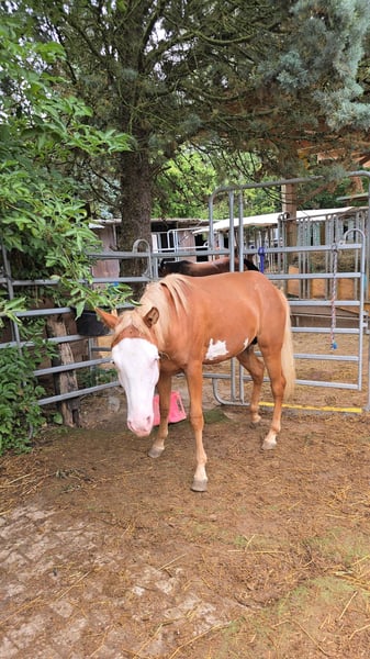LF Masson Whiz Gun - dieser wundervolle Paint Horse Junghengst, 2024 geboren mit einem geschätzten Endmaß von 152 cm, zieht mit seiner auffälligen Zeichnung alle Blicke auf sich. Das Gesamtbild wird noch durch seine blauen Augen sowie sein korrektes Gebäude abgerundet. Einmalig ist auch sein Charakter, immer gut gelaunt und sehr brav. Cool und unerschrocken zeigt er sich seiner Umwelt. Masson kennt das Fohlen ABC, ist halfterführig und liebt es geputzt zu werden. Selbstverständlich kennt er Hufschmied und Tierarzt und ist regelmäßig geimpft und entwurmt. 5-Panel n/n über die Eltern. Der Junghengst hat eine gute Reining Abstammung. Zahlreiche Reining Größen wie Colonels Smoking Gun, Topsail Whiz, Peppy San Especial und Gatling Gun hat der Hengst in seinem Pedigree. Wer ein zuverlässiges, vielseitig einsetzbares Nachwuchspferd sucht, ist bei ihm genau richtig. Er zeigt aktuell ein etwas staxelixes Gangbilder der Hinterhand - er beugt die Sprunggelenke nur zum Teil- wurde aber per Röntgenbilder abgeklärt und ist ohne Befund. Daher der günstige Preis.