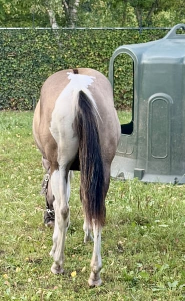 Potro APHA de color grullo Tobiano, homocigoto negro/tobiano (50 % de probabilidad de dilución dun con raya). EE aa Dd TT. Panel 7 NN. Un semental muy dócil, cariñoso y fácil de manejar. Pedigrí/pasaporte/vacunado y desparasitados, etc. Precio: 8.500 €. Para más información, por favor, contacte telefónicamente al +32/0483 39 02 03.