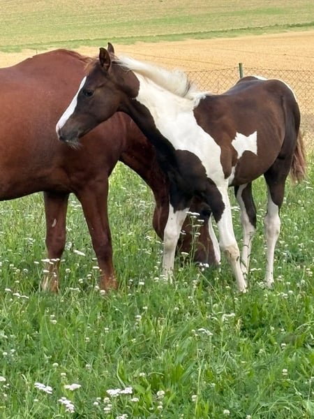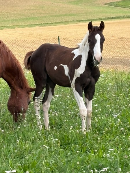 !!!Price absolutely negotiable!!! Priority over price!!! Our little Henry is looking for a new 5-star home. Henry was born at the end of April 2025. His mother is the Quarter Horse mare "Razalena Blaze" (grandfather Jac O Rima, great-grandfather Hollywood Jac 86), and his sire is the Paint Horse stallion "Grab Your Okie Boy," a direct son of Dancing Boys Okie. This little guy will receive APHA papers (application in progress), a PHCG passport, and is genetically n/n through his parents for all tested genes. However, a parentage panel test will still be conducted. Currently, he is growing up in a herd with older and younger horses in an open stable. He is well socialized. He will be ready to leave at the end of October. Henry has been regularly dewormed, is tetanus vaccinated at the time of sale, and has been regularly introduced to the farrier. This little fellow is located at home in 94424 Arnstorf.