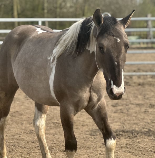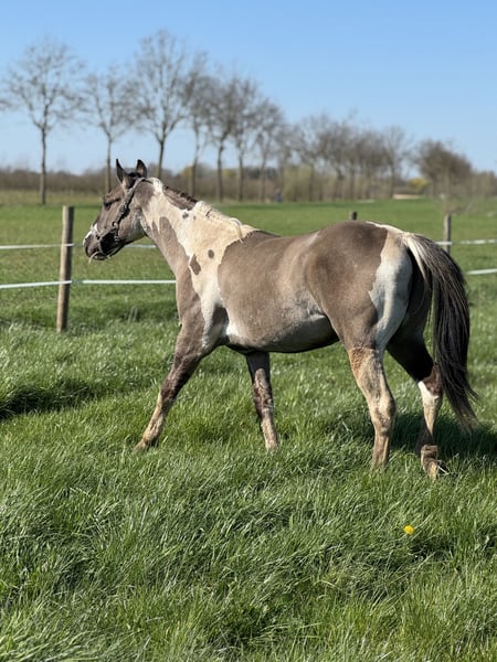 This beautiful stallion will turn 2 years old in July and has an incredibly sweet, gentle, and affectionate character. He is a very well-mannered stallion who almost seems unaware that he is a stallion. In handling he is calm, people-oriented, and very pleasant to work with. He is social with other horses, behaves well in the herd, and also enjoys going for walks outside in hand. He is already familiar with groundwork and learns new things quickly. He is also genetically very interesting for breeding. He has been Panel 7 tested and carries special color genes: • APHA with papers and BQHA passport • Double homozygous • Homozygous black • Homozygous tobiano This means he will always pass on the tobiano pattern and has a 50% chance of passing on the dun gene. In short: a super sweet, very well-behaved, and genetically interesting stallion with a bright future.