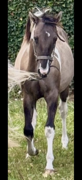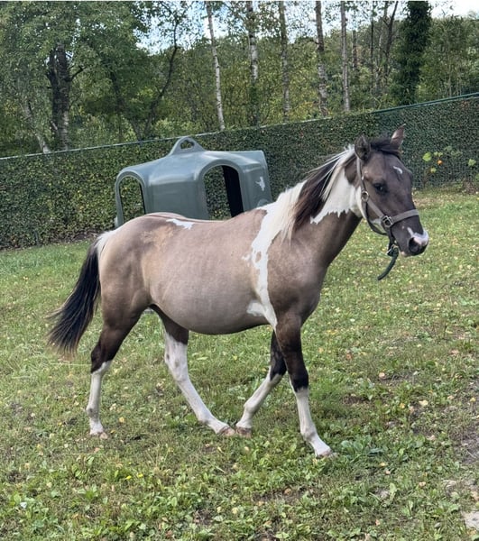 Étalon APHA gris Tobiano homozygote noir/tobiano (50 % de chance de dun-stripe) EE aa Dd TT. Panel 7 NN. Étalon très doux et affectueux, facile à manipuler. Pedigree/passeport/vacciné et vermifugé, etc. Prix : 8 500 €. Pour plus d’informations, veuillez contacter par téléphone au +32 0483 39 02 03.