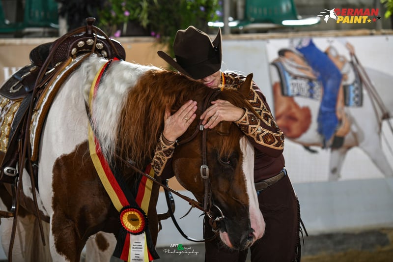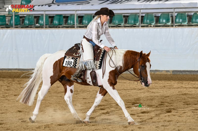 2020 kasztanowo-overo ogier APHA Ojciec: Exxcaliber Matka: SG Gunner by Mistake Twix to bardzo jeździecki ogier do zaawansowanego sportu reiningowego w kategorii non pro oraz Open. Również w ranch riding jest prawdziwym talentem ze względu na swoją jeździeckość i dobre ruchy. Jego dotychczasowe osiągnięcia mówią same za siebie. LTE> 10 T€ Rekord pokazów: 2024 German Paint Int. Mistrz Niemiec Novice Amateur Ranch Riding, Amateur Ranch Riding & Reining 2024 Euro Paint European Paint Horse Champion: Jr. Reining, Novice Amateur Reining & Nov. Amateur Ranch Riding ANC 2024 DRHA Reining Fever SBH Open Champion NCE 2024 NRHA Belgium Futurity SBH Non Pro Champion 2024 NRHA Belgium Futurity 3 & 4yo Non Pro L2-3 Top 5, L4 Top 10 2024 NRHA Breeders Futurity 4yo Non Pro L2 3rd, L3-4 Top 10 Finalist 2023 NRHA Belgium Futurity 3YO Open Res. CHAMPION LV1 2023 NRHA Belgium Futurity 3&4YO Open Champion LV1 2023 NRHA Breeders Futurity 3YO Non Pro Top 10 LV2-LV4