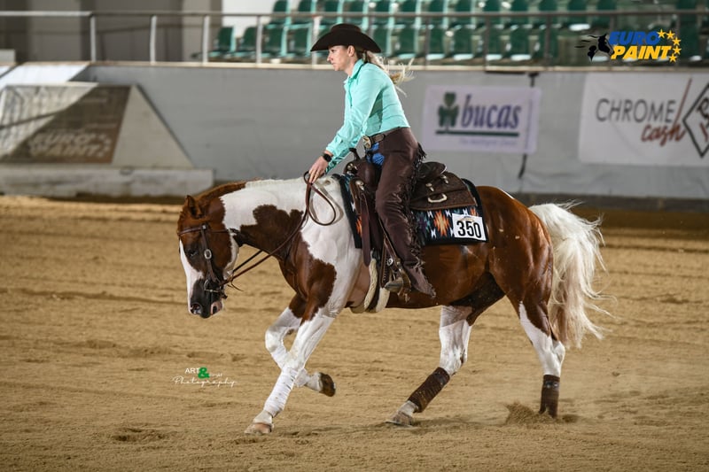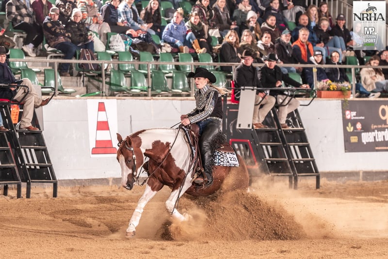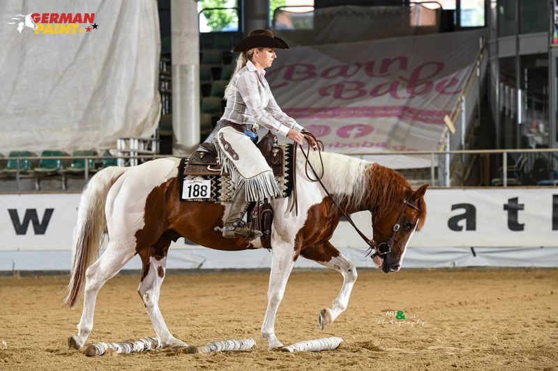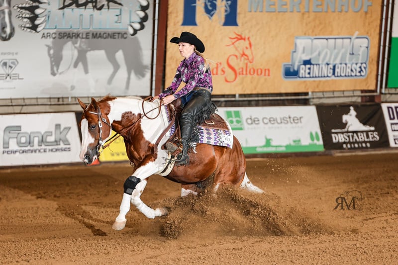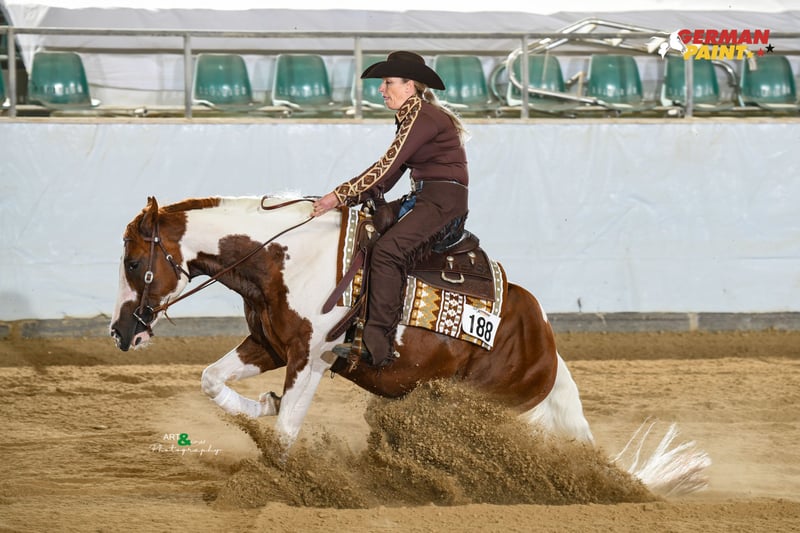 2020 kasztanowo-overo ogier APHA Ojciec: Exxcaliber Matka: SG Gunner by Mistake Twix to bardzo jeździecki ogier do zaawansowanego sportu reiningowego w kategorii non pro oraz Open. Również w ranch riding jest prawdziwym talentem ze względu na swoją jeździeckość i dobre ruchy. Jego dotychczasowe osiągnięcia mówią same za siebie. LTE> 10 T€ Rekord pokazów: 2024 German Paint Int. Mistrz Niemiec Novice Amateur Ranch Riding, Amateur Ranch Riding & Reining 2024 Euro Paint European Paint Horse Champion: Jr. Reining, Novice Amateur Reining & Nov. Amateur Ranch Riding ANC 2024 DRHA Reining Fever SBH Open Champion NCE 2024 NRHA Belgium Futurity SBH Non Pro Champion 2024 NRHA Belgium Futurity 3 & 4yo Non Pro L2-3 Top 5, L4 Top 10 2024 NRHA Breeders Futurity 4yo Non Pro L2 3rd, L3-4 Top 10 Finalist 2023 NRHA Belgium Futurity 3YO Open Res. CHAMPION LV1 2023 NRHA Belgium Futurity 3&4YO Open Champion LV1 2023 NRHA Breeders Futurity 3YO Non Pro Top 10 LV2-LV4