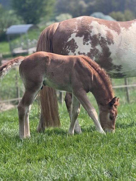 Verkaufe American Paint Horse Hengst – 02.04.2026 Anpaarung: Gunsparks Lohrberg Ranch x Sallys Sweet Candy Dieser charmante kleine American Paint Horse Hengst besticht durch sein freundliches und souveränes Verhalten, zudem hat er ein sehr gutes Fundament und schöne Bewegungen. Mit einem Stockmaß von ca. 148-154 cm Endmass, ist er ein kompakter und eleganter Nachwuchshengst, der sich ideal für Freizeit und Sport eignet. Seine Vollschwester kann hier in der Herde besichtigt werden, der Vollbruder ist bereits verkauft. Beide wurden erfolgreich auf einer PHCG Zuchtschau vorgestellt. (Prämienfohlen 1a/1b) Schwester: Champion of Champion Futurity 2023 PHCG Bei Interesse freue ich mich auf Ihre Kontaktaufnahme, um weitere Informationen auszutauschen oder einen Besichtigungstermin zu vereinbaren.