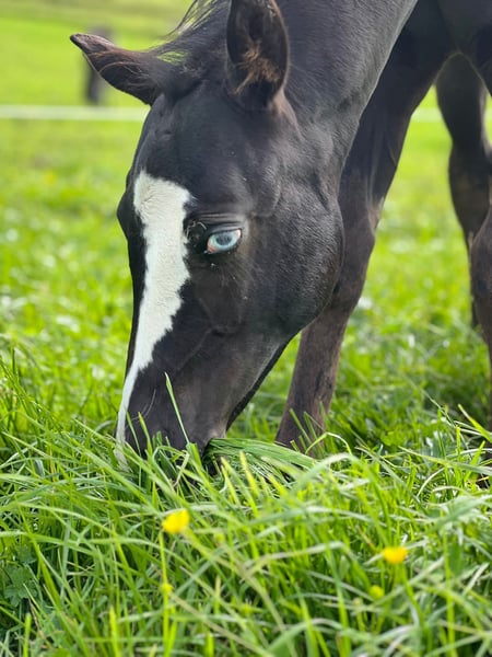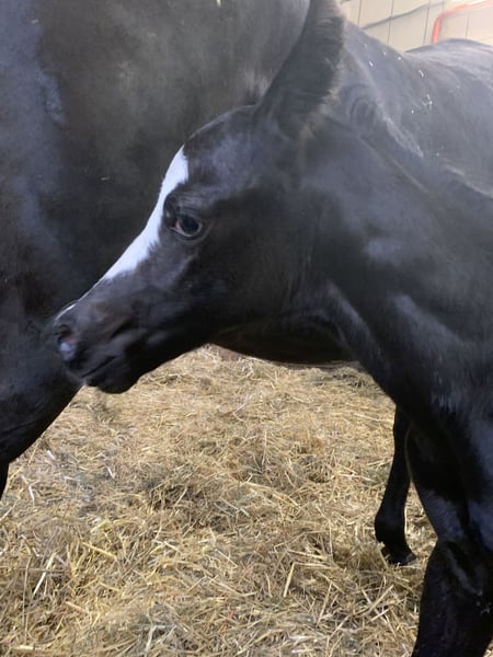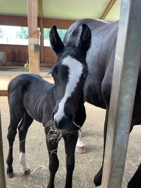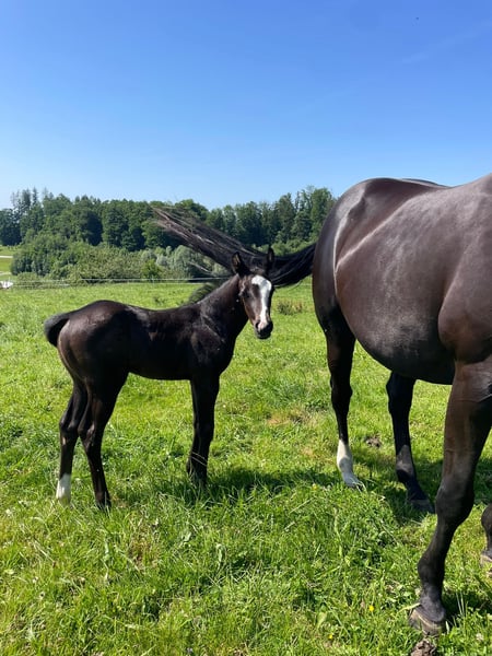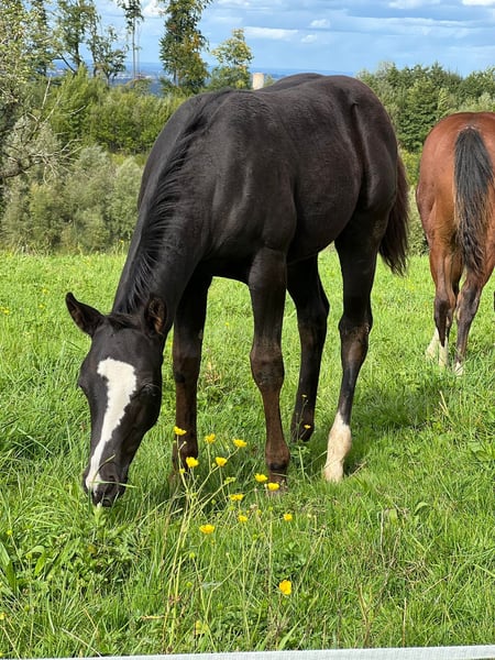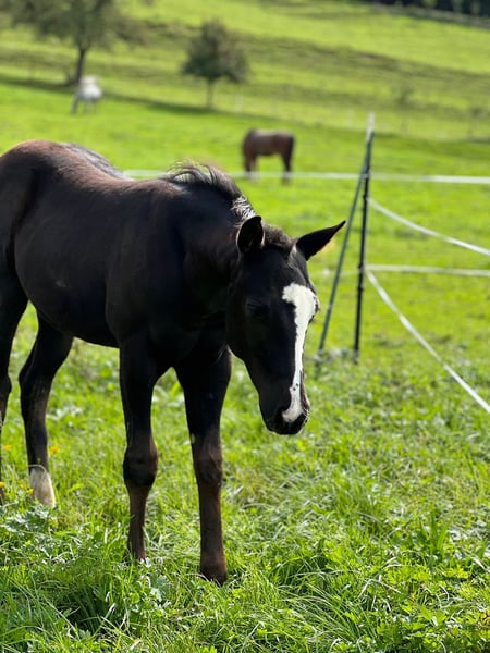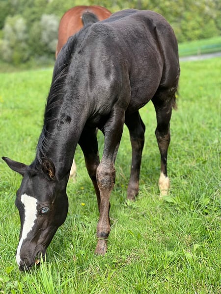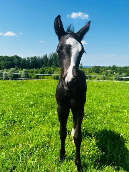 Sky captivates not only with his color but also with his character. He has already participated in a foal show and was rated excellently. Sky masters the foal ABC. He lives in a mixed group and is growing up in a species-appropriate manner. He is homozygous black and carries the overo gene. Sky is looking for a five-star home starting in December.