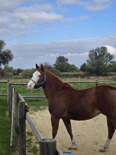 Najla ist eine ganz tolle und liebe Stute die hier allerdings einfach viel zu kurz kommt. Najla hat in jungen Jahren eine klassische Westerngrundausbildung bekommen, wurde aber nie geshowt oder weiter gefördert. Sie kann ein paar wenige Manöver wie z.B. den Spin. Aber ich würde sie eher als gut ausgebildetes Freizeitpferd beschreiben. Bei uns steht sie im Offenstall mit unseren Minishettys zusammen ist lieb im Umgang und auch gut zu reiten. Allerdings steht sie eigentlich mehr als Beisteller für die Minis und hier liegt auch der Grund für die Abgabe. Mit ihren 10 Jahren führt Najla quasi ein Rentnerleben und das ist einfach viel zu schade....hier muss ich ehrlich und fair gegenüber dem Pferd sein und meine Wendybrille ablegen. Sie ist fit und gesund und kann noch viele Jahre da draußen einen Menschen wirklich glücklich machen und sich selber natürlich auch....denn auch die regelmäßige Bewegung ist für die Gesunderhaltung des Pferdes das A und O. Ich sehe Najla eher als Frauenpferd. Sie ist eher gemütlich unterwegs und passt eigentlich gut mit auf. Wenn von oben nicht die passende Hilfe kommt dann bleibt sie lieber stehen. Im Gelände ist sie brav unterwegs und geht auch alleine....aber auch das ist hier leider viel zu kurz gekommen. Sie kann aber auch sehr eigensinnig sein. Bei neuen Dingen und wenn ihr was nicht gefällt versucht sie erstmal ihren Standpunkt klar zu stellen. Wenn sie aber erstmal verstanden hat das diese sachen doch nicht so schlimm sind arbeitet sie wieder gut mit....eigentlich ein Grundehrliches Pferd. Najla läuft bei uns Barhuf und im Winter wird sie eingedeckt. Ein kleines Manko hat sie allerdings. Sie hat ein wenig mit den Bronchien zu kämpfen, auffällig ist es hier während der Pollenzeit. Sie wird bei uns in der Zeit Inhaliert bekommt aber sonst bisher keinerlei Medikamente oder ähnliches....deshalb wäre ein Platz im Offenstall wünschenswert....auch wenn Najla selbst lieber Boxenpferd wäre. Die Abgabe fällt mir nicht leicht denn sie ist mein persönliches Traumpferd....aber unter den Umständen das ich ihr einfach nicht die Aufmerksamkeit schenken kann die sie eigentlich absolut verdient, dann muss man zum wohl des ponys handeln und nicht anders rum. Najla würde bei Abgabe ihre komplette Ausrüstung mitbringen inkl. gutem Markensattel. Da es sich hier um eine Vernunftabgabe handelt und nicht um einen Notverkauf habe ich Zeit das passende Zuhause für Sie zu finden. Ein gutes zuhause steht hier an erster Stelle daher Platz vor Preis (aber natürlich im realistischem Rahmen) Sie kann nach Absprache jederzeit besichtigt werden. Und bei weiteren Fragen stehe ich selbstverständlich gerne zur Verfügung.