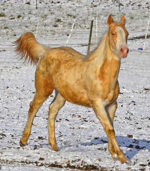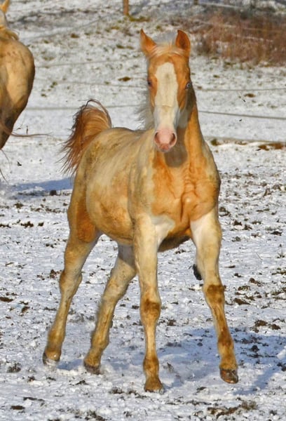 OBNIŻONA DO 01.04. Brezel jest homozygotyczna dla Tobiano i Champagne! Jej źrebięta zawsze będą kolorowe i w kolorze Champagne. Sama jest złotą Champagne Dun sroką. Oczywiście również 7 Panel N/N. Otrzyma paszport i dokumenty od APHA i PHCG. Brezel ma niebieskie oko. Jest małą łamaczką serc, która naprawdę domaga się głaskania.