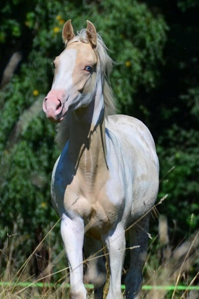 Brezel è omozigote per Tobiano e Champagne! I suoi puledri saranno sempre colorati e color champagne. Lei stessa è un pinto Gold Champagne. Ovviamente anche 7 pannelli N/N. Ha il passaporto e i documenti dell'APHA e del PHCG. Brezel ha un occhio blu. È una piccola rubacuori che chiede di essere grattata.