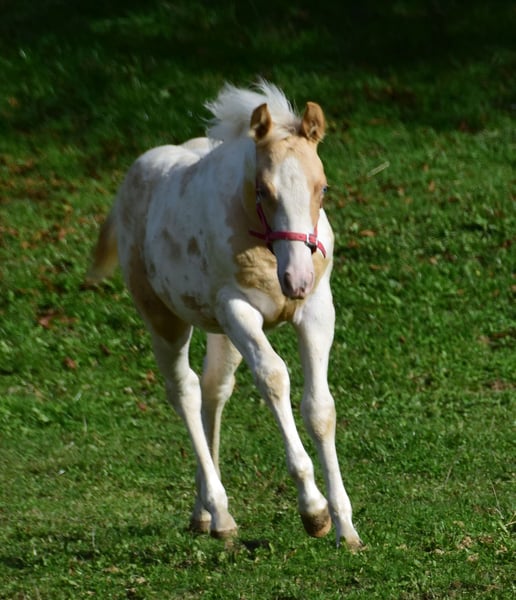 Brezel ist homozygot für Tobiano und Champagne! Ihre Fohlen werden immer bunt und Champagne Farben sein. Sie selber ist ein Gold Champagne Dun Schecke. Natürlich auch 7 Panel N/N. Sie bekommt Pass und Papiere von der APHA und PHCG. Brezel hat ein blaues Auge. Sie ist eine kleine Herzensbrecherin, die Krauleinheiten richtig einfordert.