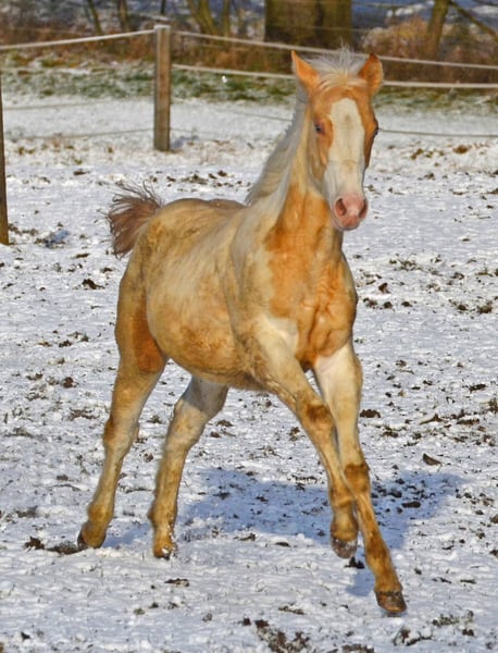 Brezel is homozygous for Tobiano and Champagne! Her foals will always be colorful and Champagne colors. She herself is a Gold Champagne pinto. Of course also 7 panel N/N. She gets passport and papers from the APHA and PHCG. Brezel has a blue eye. She is a little heartbreaker who really demands to be scratched.