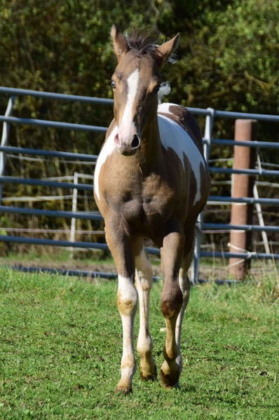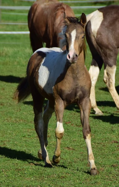 Miral to Amber Champagne o doskonałym ruchu i bardzo słodkiej, łagodnej naturze. Jest homozygotyczna dla genu tobiano i zawsze będzie produkować tylko kolorowe źrebięta. Jest koniem farbowanym z pełnym papierem i 7 panelem N/N. Dorasta tutaj w sposób odpowiedni dla gatunku w dużym stadzie. Oczywiście będzie regularnie odrobaczana i szczepiona, z dokumentami i paszportem.