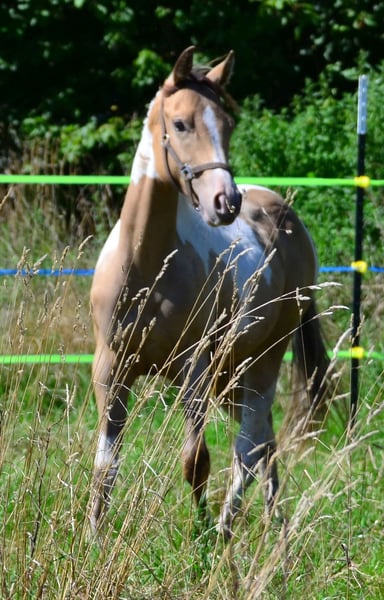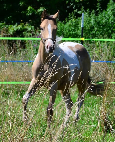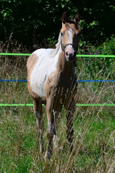 Miral is Amber Champagne, a brilliant mover and a very sweet, gentle nature. She is homozygous for the tobiano gene and will only ever produce colorful foals. She is a Paint Horse with full paper and 7 panel N/N. Grows up here in a species-appropriate manner in a large herd. She will of course be regularly wormed and vaccinated, with papers and passport.