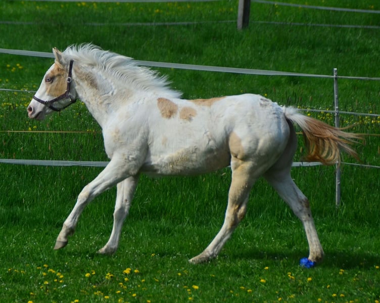 Lyria ist ein wunderschönes Paint Horse Stütchen in Gold Dun Champagne Tovero, mit zwei stahlblauen Augen. Geboren 03.06.2023 Sie ist schmusig, lieb, und bestens erzogen. Hat gern mal den Huf auf dem Gaspedal, und düst über die Koppel. Zeigt dabei ihr wahnsinns Talent für Tempo Kontrolle, Galoppwechsel und Stops! Sie ist über die Eltern 7 Panel N/N. Lyria gewann die Zuchsthow des PHCG der Stutfohlen mit einer 8,0 Gesammtnote.