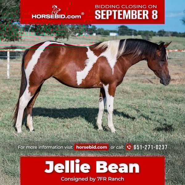 ♦️ 𝐭𝐡𝐞 𝐒𝐞𝐩𝐭𝐞𝐦𝐛𝐞𝐫 𝑺𝒆𝒍𝒆𝒄𝒕 ♦️ Happening now thru MONDAY | SEPTEMBER 8th - Available EXCLUSIVELY on HorseBid's website! For more details and to register visit: www.Horsebid.com CONSIGNOR CONTACT: 7FR Ranch 651-271-0237 LOCATION: Normangee, TX BREED: Paint REGISTERED: Yes REGISTERED NAME: QTS Uvalde Gal COLOR: Bay Tobiano HEIGHT: 14.2 AGE: 2 GENDER: Mare Jellie bean's sweet and gentle nature makes her an absolute joy to be around. She's the kind of horse that will greet you with a soft nuzzle and a willing attitude. Her impeccable ground manners make her a favorite in the barn. She ties, loads, baths, and crosses water with ease, making her an stress-free companion for any adventure. Jellie Bean has always been a joy to be around and was a dream to start. She has never offered to buck or show any resistance. She has a heart of gold and is willing to please. Jellie Bean has 60 rides under her belt and is ready to move forward in any direction you’d like. Please contact Molly Falconer for any additional questions. 651-271-0237