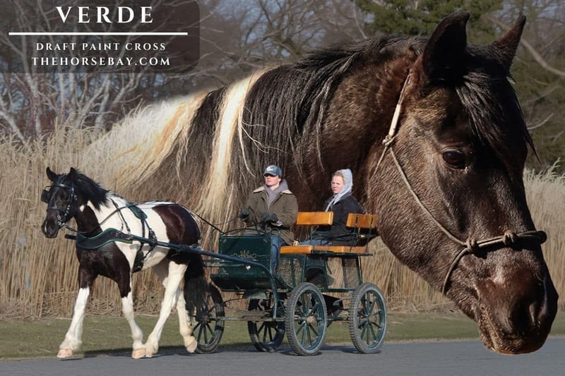 Introducing Verde, a 5-year-old Draft Paint Cross Mare standing at a solid 15 hands tall. Verde both Rides & Drives! She is safe and fun both ways. She is nice and stout to carry a bigger rider, but she is not overly drafty. For driving, Verde is good for hitching, getting on/off the cart, stop signs, and stoplights. She is fine with traffic; she has been driven past semis and heavy traffic, and she never bats an eye. She is easy to control on the lines and drives in just a snaffle bit. She knows the words walk on, trot, easy, and whoa. She automatically starts slowing down when she sees a stop sign coming up. This isn’t her first rodeo; she has loads of road experience and does NOT spook easily. She has a very solid mind. For riding, she is a blast. She’ll take her canter right off of a walk. Has a nice, smooth, easy-to-sit-to canter. And her trot is smooth as well. For being a draft, she is NOT clumsy; she has just enough draft to make her quiet, yet not too much to make her lazy. She is a good mixture. She’ll go anywhere out on the trails; she has NO fear whatsoever. She is very smart and picks up on new things quickly. She’ll go up or down a steep bank, through the creeks, rivers, and over the bridges, big or small. She will ride out alone, away from home, and ride fine in a group. She is the “in-your-pocket” type, so very personable and friendly. Loves to come greet you anytime you go out in her pasture, so she is easy to catch. And loves getting scratches and pettings, she is almost like a big dog. She loads and hauls great. Stands still for tacking and mounting. She is an easy keeper and NO maintenance required. Your farrier is going to LOVE her she stands stock still for the hot shoe treatment. She is also great at baths; she does not mind the hose. She gets along out in the herd; she is middle of the pecking order. This girl is DOWN TO EARTH, absolutely NO drama or nonsense. She has a get-her-done attitude as well as a been-there-and-done-that demeanor. And she is used to riding with a doggy sidekick named Tramp. So she is quite used to his shenanigans of running full speed up behind her and popping in and out of the brush in front and behind her. She has also had several neighbor dogs come out at her while driving, and she doesn’t blink; her eye just gets on with her job. Most of the neighbor dogs that come out either want to play or just bark at her, but there is one that comes and tries to nip her legs, and she just ignores them all. She is fine with wildlife out on the trail as well. She is great for brush popping and making new trails. She will plow through any thick brush and doesn’t mind if it gets caught up in her legs or comes up and hits her in the hind end. She will stand well for breaking branches overhead as well. And I just love how she takes the steep banks. She doesn’t refuse to go; instead, she finds a way, either climbing up a steep bank or hopping up it if needed. She has NO fear whatsoever, at least I haven’t found anything yet that bothers her. I really believe horses with that curious personality, like Verde, are just generally more willing to please and less bothered by new things that they may run into. And with her willingness to please and wanting to be your partner, she could easily go into another direction besides the driving and trails if someone wanted to take her there. And she’s young enough to do it. I could see her being a natural at fox hunting or doing some fun jumps. As she will jump over logs out on the trail with natural agility and willingness. And with Verde, there are NO unknowns; we have her entire history. So her story starts in Montana out west very romantic western themed setting I know… Anyways she gave these poor creatures (I think they are called humans) carriage rides through town. Because she’s just that sweet, she felt sorry for those lazy, poor, two-legged people. She also gave rides and was known around town by almost everyone. But then one day she decided to move eastward and see some country. And now she’s residing here in Michigan, still giving people rides both in the saddle and the carriage. And to this day, she ponders one of life’s greatest philosophical questions to all horses… And that is… Why do humans need horses to pull a carriage into town when they own a car? I don’t think she’ll ever have her answer, but she’s ready for some new adventures with her new forever human. She comes up to date on everything: vet check, coggins, shots, dewormings, and farrier. Just call with any questions or to come see her in person.