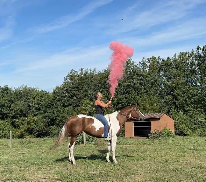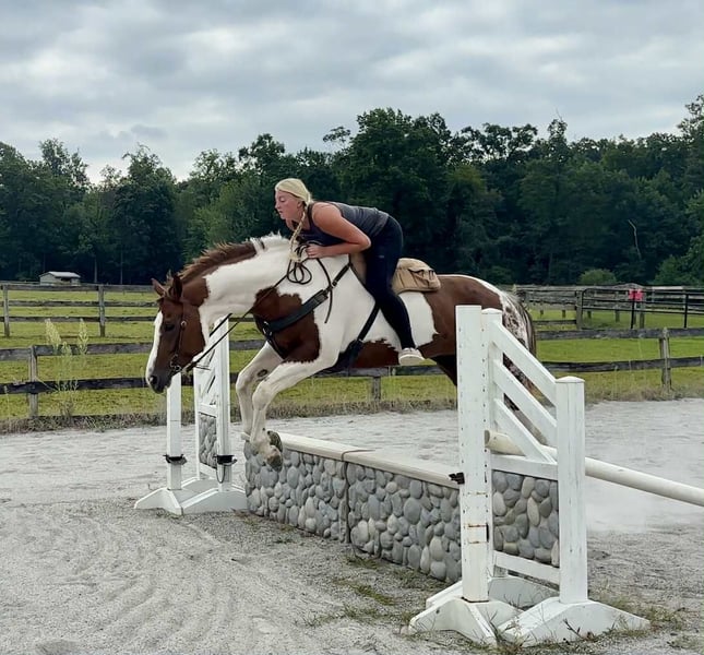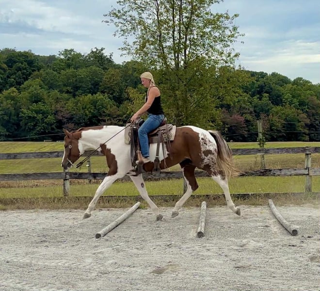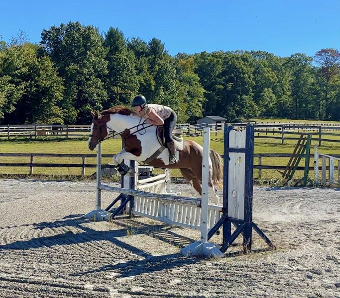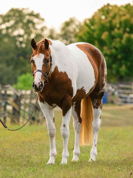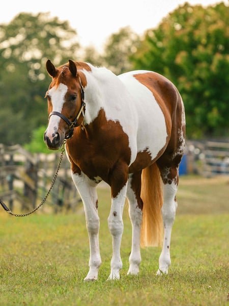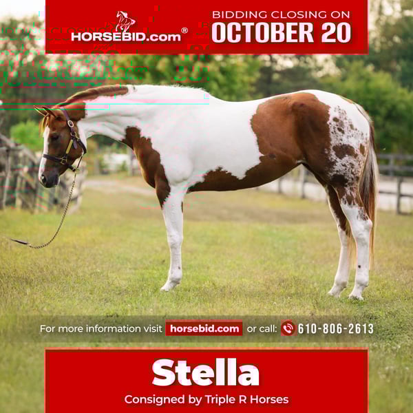 ♦️ 𝐭𝐡𝐞 𝐀𝐌𝐄𝐑𝐈𝐂𝐀𝐍 𝓕𝓪𝓵𝓵 𝓒𝓵𝓪𝓼𝓼𝓲𝓬 ♦️ Happening now thru MONDAY | OCTOBER 20th - Available EXCLUSIVELY on HorseBid's website! For more details and to register visit: www.Horsebid.com CONSIGNOR CONTACT: Triple R Horses 610-806-2613 LOCATION: New Holland, PA BREED: APHA REGISTERED: Yes REGISTERED NAME: Change The Code COLOR: Chestnut Tobiano HEIGHT: 16.1 AGE: 5 GENDER: Mare “Change The Code” lovingly known as “Stella” is a 16.1hh, chestnut tobiano mare. Stella is classy, safe, kind, honest, and a total do-it-all horse, with limitless opportunities!!! If you are looking to turn heads, and feel safe on your equine partner, this is the girl for you. Not only is Stella as stunning as they come, she has a fabulous pedigree, and she is grandsired by the famous “VS Code Red”. Whether you are looking for a show horse, a trusty trail partner, a husband horse, family horse, or an all around versatile pal, Stella is ready to step up and take any role that your heart desires. Stella can live in or out, with a mixed group, or by herself. She is not marish in a herd, and she will make it a point to be the first one to greet you in the pasture. She will follow you around in the pasture and is extremely nosey. She is in your pocket and in my opinion prefers the company of humans sometimes, rather than horses. I can really appreciate her attitude towards others, the boys can be up her butt in the pasture and I have never seen her be mean towards them, she is one of the bros. Even when she is in heat, you can’t tell, she doesn’t holler for the geldings etc. In the barn she has zero bad habits. No cribbing, chewing, weaving. When she is in heat, and you enter her stall while she is eating, she will make a mare face, but does absolutely nothing mean or rude. She will hang her head out of her stall and ask for love and proceed to fall asleep in your arms. Stella stands on the cross ties to be groomed, tacked, bathed, etc. She doesn’t care about dogs or kids running around and is very appreciative of attention. She is safe for beginners to work with and around, as well as kids and small children. Stella has good ground manners, and can be trusted with novice horse people. Stella is great for the vet and farrier. She is an easy keeper with a simple diet, no maintenance, and never asks for anything. Stella absolutely loves trail riding. She is always up for a good adventure, and takes care of her rider. Stella will lead, follow, go alone and in groups. She crosses water, bridges, logs, rocks, safe with traffic, bikes, wildlife, dogs trailing her heels, you name it!!! She has packed around my guests and friends and would make an awesome husband horse. She loves to explore and is sure footed. Through thick brush, along side of a lake, to a trail as skinny as her hooves with a cliff on both side, Stella has proved to be a very trusted, safe, trail partner. I could see her enjoying camping, fox hunting, paper chases and more. I even pulled her bridle off and rode her for about an hour with just a neck rope. I added lots of trail videos to show her good mind, and love for trails. She is safe around cows and is good friends with my mini cow. Stella is brave on the trails and not spooky. Stella rides western, english, and bareback. She will ride in anything from a halter and lead rope, to a shank bit. She is soft in your hands and listens well to your cues. Stella will ride off of your seat, or hands. While her gaits are big and floaty, she is comfortable and has great rhythm. She has soft buttons, meaning she can have fun with an advanced rider, yet is subtle and gentle enough for kids and beginners. I haven’t met a horse as versatile as miss Stella in a long time. She is such a joy to ride and play with different disciplines. Stella throws potential in every single direction. Not only would she be a super star with western dressage, but classical dressage too. I can see her doing ranch trail classes, trail obstacle courses, and more. Stella is already a proven show horse, she knows the ropes and has the grit. In the ring, Stella will walk, trot, canter, and knows her leads. She will ride collected or on the buckle, and I have also ridden her without a bridle. Stella will move laterally off of leg, pivot, side pass, back up, whoa, and neck reins. She has been started on a lead change as well. You can adjust her head set for the different disciplines. She is the same horse every time, whether she sits for weeks or is ridden all week. I would consider her the perfect combo of whoa and go. She will happily go around slow and easy yet you don’t need a crop and spurs to ask her to go to work. She can do a job for you then come right back down for a kid to hop on. She is very mature especially for her age, and if her brain is this good now, it will only get better. Her previous connections did a splendid job with her, and everyone that meets her, loves her. Stella was very lightly introduced to fences when I purchased her. I have also lightly furthered along in that department. Since she is young, she has not been pushed. And all of the jumping she has done so far in life has been for fun. She shows an interest in jumping, and I did recently raise the pole a little and she had plenty of scope. Since she is five, cross rails and small stuff is plenty for her right now. But she showed me that she has the ability to go higher. I also introduced her to cross county fences, first lunging her over them, then popping over one time under saddle. She did great so I left it at that. As she matures and gets older, her future owner could have a lot of fun with jumping. She could easily be a fox hunter, or a hunter jumper. Her experience with jumping so far has been slow and steady. Setting her up for success in the future! With Stella’s beautiful movement, and scope over fences, I could totally see her rocking it in the eventing world. Stella has