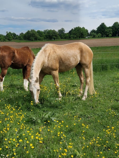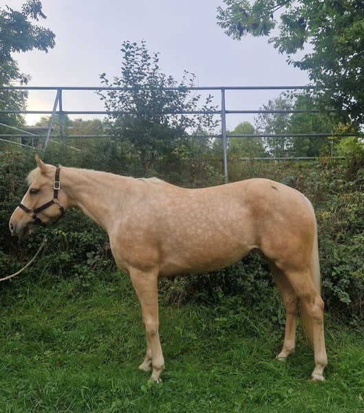 Unsere liebe Holly ist eine Stute mit einem ganz besonderen Wesen. Sie ist freundlich, feinfühlig und zeigt im täglichen Umgang eine angenehme Ruhe. Nicht schreckhaft, klar im Kopf und sehr menschenbezogen- eine treue Seele, die ihrem Menschen gefallen möchte. Beim Einreiten hat sie sich von Anfang an kooperativ und mutig gezeigt. Sie war über den Sommer 2025 drei Monate im Beritt und wird aktuell von mir (Trainer B Westernreiten) weiter ausgebildet. Besonders im Gelände fühlt sie sich wohl- sie geht neugierig und entspannt, sowohl allein als auch in der Gruppe. Holly braucht etwas Zeit, um sich auf neue Menschen einzulassen- mit ihrer Bezugsperson zeigt sie jedoch ihr volles Vertrauen und arbeitet motiviert mit. Für jemanden, der ihr dieses Vertrauen schenkt, wird sie ein wundervolles Pferd mit großem Herz. Ich habe sie inzwischen auch ein wenig für Reitunterricht genutzt und sie wird immer selbstsicherer auch unter anderen Reitern. Bei ihr wurde im Sommer 2025 Arthrose im Sprunggelenk diagnostiziert. Diese ist aber nun verknöchert und es gibt derzeit keine Probleme damit. Sie war immer lahmfrei. Sie bringt so viel Lebensfreude mit und eignet sich perspektivisch für Freizeitreiter, schöne Stunden im Gelände, kann aber auch gut auf dem Platz oder in der Halle geritten und weiter ausgebildet werden. Wir wünschen uns für Holly ein liebevolles Zuhause bei Menschen, die Erfahrung, Geduld und ein Herz für besondere Pferde mitbringen. bei Interesse freuen wir uns über eine Nachricht und ein persönliches Kennenlernen! Ein passender Sattel und weiteres Equipment können ebenfalls erworben werden.