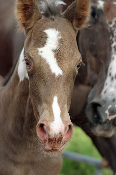 CHEYENNES VUDUTELLA Classic Champagne Tobiano APHA Stute. Geboren: 24.05.2025 Endgrösse ca 150 cm 7 Panel N/N Ee aa CHch Tt