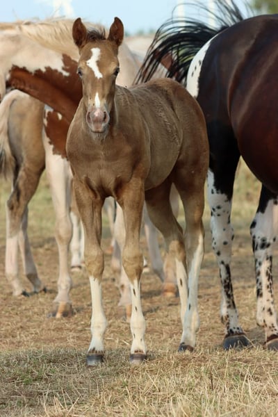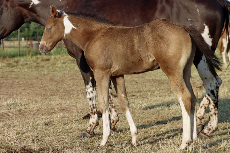 CHEYENNES VUDUTELLA Classic Champagne Tobiano APHA mare. Born: 24.05.2025 Expected height approx. 150 cm 7 Panel N/N Ee aa CHch Tt