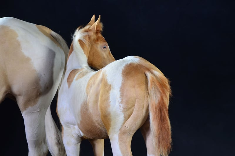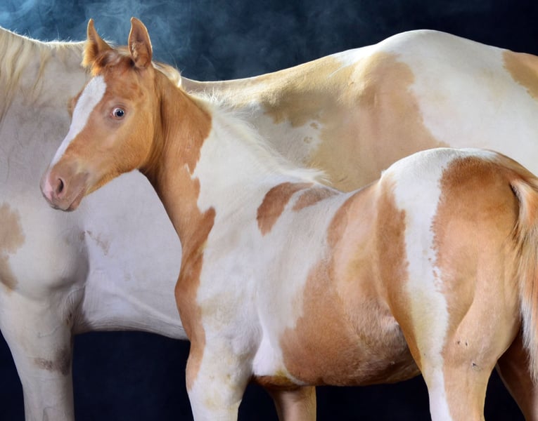 Babatte is a Paint Horse filly in Gold Champagne, homozygous for the Champagne gene. She was presented at the PHCG breeding show and received an impressive overall score of 7.95. She is 7 Panel N/N and naturally has full Paint papers. She is growing up in a large herd in a species-appropriate manner. Her character is golden, and she always wants to please. She loves to cuddle and seeks human closeness in a gentle way.