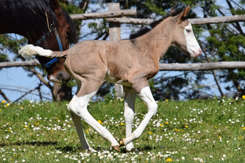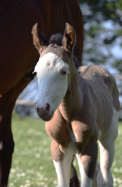 Superbe pouliche paint horse pp née en mars 2026 Grullo Homozygote splash , 2 yeux bleus . Panels 7 négatifs Par shining c tyler & iowa miss spice kay 80% de quarter horse dans les papiers Lignée intéressante pour élevage et ou loisir , amateur