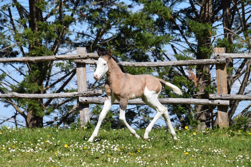 Stunning Paint Horse Filly PP Born March 2026 Grullo Homozygous Splash, with two blue eyes. Panels 7 negative. Sired by Shining C Tyler & Iowa Miss Spice Kay. 80% Quarter Horse in pedigree. Interesting lineage for breeding and/or recreational riding, suitable for amateurs.