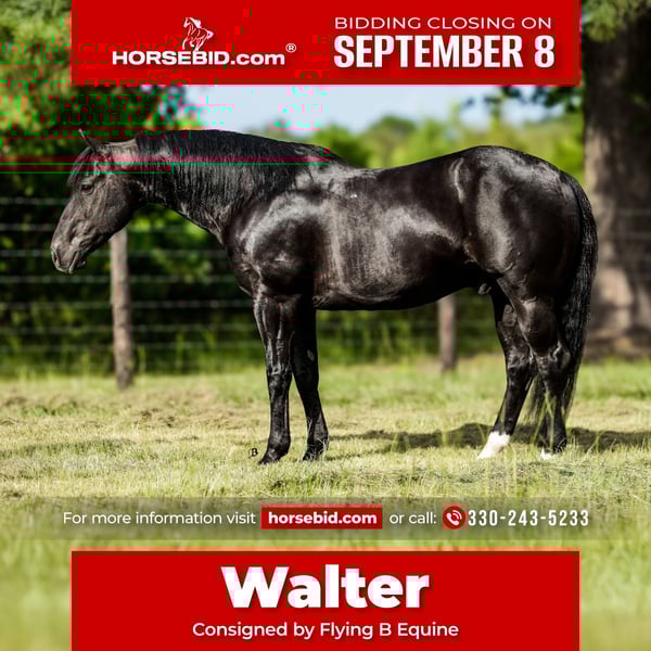 ♦️ 𝐭𝐡𝐞 𝐒𝐞𝐩𝐭𝐞𝐦𝐛𝐞𝐫 𝑺𝒆𝒍𝒆𝒄𝒕 ♦️ Happening now thru MONDAY | SEPTEMBER 8th - Available EXCLUSIVELY on HorseBid's website! For more details and to register visit: www.Horsebid.com CONSIGNOR CONTACT: Flying B Equine 330-243-5233 LOCATION: Lufkin, TX BREED: Apha REGISTERED: Yes REGISTERED NAME: Norfleet Aftermidnite COLOR: Black HEIGHT: 15 AGE: 10 GENDER: Gelding Norfleet Aftermidnite affectionally known as Walter is a 2015 APHA gelding standing 15.0HH. This beautiful jet black gelding has all the traits a person could ever want! YEARS of professional training in the liberty, fully trick trained, shown in the western and regular dressage, DRIVES, trail rides, packs beginners in lessons and has an amazing personality to boot! OH, AND he lays down! Walter is an absolute blast to ride and enjoy! English or western, beginner or professional, anyone can truly enjoy riding him! He has beautiful movement, effortless transitions, and cues on voice, leg, or seat commands, you choose! He has a solid WTC, knows his leads, collects onto the bridle, extends and has a slow sitting trot. He will do ranch riding and rail transitions. He is finished and perfectly maintainable at home by an amateur. He has a ton of “fun” buttons as I call them! He will bow, lay down from the ground or on his back, and is mark trained. He will chase and follow you with his liberty training and lope circles around you with no halter or lunge line! Out on the trails, Walter is an easy going guy! He will ride out alone or in a group. He crosses all the different terrain, water crossings, obstacles and brush. He is confident wherever you point him! He truly is a breeze and the perfect boozy trail riding or beach riding partner. Walter is broke to drive single, as well as has been used as a ranch horse. You can rope and drag calves on him if needed! He will open and close gates, drag logs, and move or sort cattle. He’s also been exposed to all type of animals including donkeys, geese, dogs and goats! Back at the barn, Walter has no vices, stands for the farrier, loads and unloads, ties, etc. He is an easy keeper, no maintenance, and UTD on everything. He is great in the pasture and easy to catch. He will meet you at the gate every time! You are more than welcome to come meet Walter at our place in Lufkin, Texas. We have a current PPE on file, and you’re welcome to do your own! We can help arrange shipping absolutely anywhere! Please call Bailey with any questions, (330) 243-5233.
