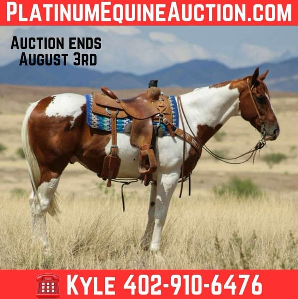 ONLINE AUCTION Place your bids at www.PlatinumEquineAuction.com Starting Bid $3500 Auction ends August 3rd, 2025 Need a new saddle? Check out White Rock Saddles on our website or Facebook Hard On The Rocks aka Rip is a Beautiful, Seasoned Sorrel Tobiano Paint, that is a 2015 model, reg APHA, gelding that is standing 15.1hh. Rip is a handsome paint gelding with all the experience and heart you could ask for. Rip has been used extensively on the ranch and trails. He’s gathered cattle in big mountain country, crossed rivers, navigated rocky terrain, and he’s no stranger to a long day’s work. He’s also been ridden through town — traffic-safe, calm, and steady no matter the situation. One of Rip’s best qualities? He’s easy to leave off and easy to bring back. Whether it’s been a week or a month, he saddles up quiet and rides off like a gentleman. He’s smooth, easy to ride, and gets along well with other horses in the pasture or on the trail. While he’s good for anyone, Rip does seem to have a soft spot for the ladies — he’s happiest with a kind, quiet rider. If you want a horse that’s been there, done that, and still has plenty of good years ahead of him, Rip is your guy. He is located in Nogales, AZ. Contact Kyle with Thunder Valley Ranch 402-910-6476 with any questions. Shipping is available anywhere in the US. ONLINE AUCTION Place your bids at www.PlatinumEquineAuction.com Starting Bid $3500 Auction ends August 3rd, 2025 Need a new saddle? Check out White Rock Saddles on our website or Facebook