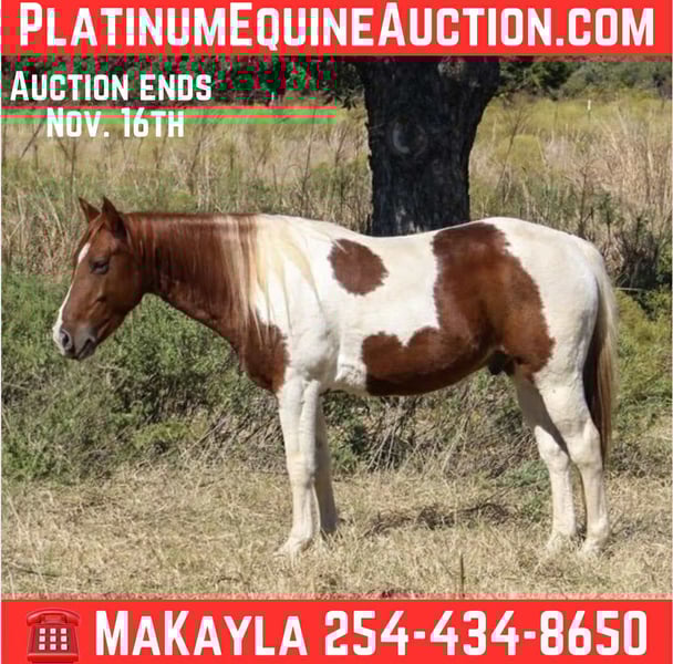 ONLINE AUCTION Place your bids at www.PlatinumEquineAuction.com Starting Bid $3500 Auction ends November 16th, 2025 Need a new saddle? Check out White Rock Saddles on our website or Facebook Boots is a 10 year-old sorrel tobiano paint gelding, standing at 14 hands tall. He will catch anyone’s eye anywhere you decide to take him with his stunning color. He would be a great family horse as that’s what he has been for the last two years. He’s been many miles on trails all over. He is a safe horse looking for a lifelong friend. Boots has been used for lessons, trail riding, wagon races and much more. He is more whoa than go but if you ask him to trot and lope he will do it for you and stop when you ask! He goes through anything you point him to go through or over. Rides out alone or in a group. Very good in town and through traffic. He can sit forever and still ride off with no funny business. If you can sit up there and hold his reins you and him will get along! Boots has absolutely no buck, rear, or kick! Loads like a champ and unloads great. He also stands well for the farrier. Boots is a reliable pretty boy, making him a great addition to any family! Come see him for yourself or we can schedule a FaceTime to meet him! Call or text Makayla with MW Horses at 254-434-8650. Need hauling? We got a list of reliable haulers around the US! Located in Poolville,Texas. ONLINE AUCTION Place your bids at www.PlatinumEquineAuction.com Starting Bid $3500 Auction ends November 16th, 2025 Need a new saddle? Check out White Rock Saddles on our website or Facebook
