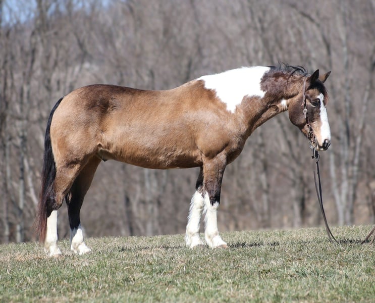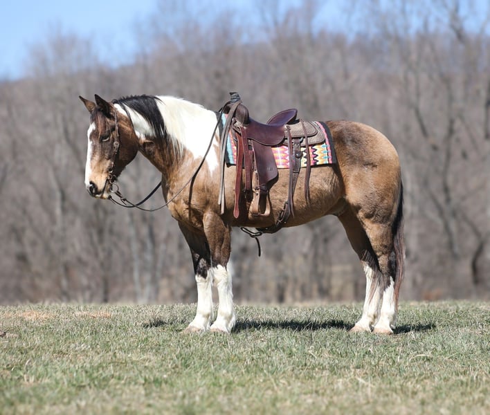 ONLINE AUCTION Place your bids at www.PlatinumEquineAuction.com Starting Bid $3500 Auction ends March 30th, 2025 Need a new saddle? Check out White Rock Saddles on our website or Facebook! Doc Holiday is a beautiful Buckskin Tobiano Paint Draftcross Gelding that is standing 15.1hh and he is a 11 years old! Doc is very stout built with a thick bone and big solid hoof, he is built for the long haul! Doc is a blue collar horse who has got up every morning and went to work making an honest living as a ranch horse. He has worked on a cow/calf operation, pasture roped/doctored/tagged. He has penned cattle at the sale barn and worked on a feedlot as well. Doc has lots of experience and is a well rounded horse that can go in any direction. He lopes nice slow circles, catches the correct leads, has a good stop and reins a circle each way. Doc is great on the trails and nothing phases him! He is content to mosey and loves going on trail rides. He will cross creeks, ditches, logs and navigate rough rocky areas. Doc has been exposed to all kinds of wildlife and will go anywhere that he is asked too. He has been rode many miles in the mountains and encountered every obstacle possible on the trail. He will go up or down even the steepest slopes, across deep creeks, over downed trees, and over all types of rough terrain while still being sure footed. Doc has been ridden down the highways and is traffic safe as well. If you want to cruise along down the trails or go out rope and tie one down Doc is a horse that will fit the bill! If you have any questions, would like to make a Buy It Now Offer or set up a Facetime Call, contact Lucky 13 Equine Matt 765-698-4655 or Lysandra 765-717-2041 Located in Brodhead, KY. ONLINE AUCTION Place your bids at www.PlatinumEquineAuction.com Starting Bid $3500 Auction ends March 30th, 2025 Need a new saddle? Check out White Rock Saddles on our website or Facebook!