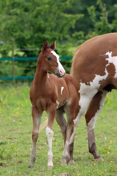 CHEYENNES JUJU PISTOL Bay frame overo Étalon APHA Né le 12.05.2024 Taille finale environ 150 cm 5 Panneau et IMM N/N Ee Aa LWO/N