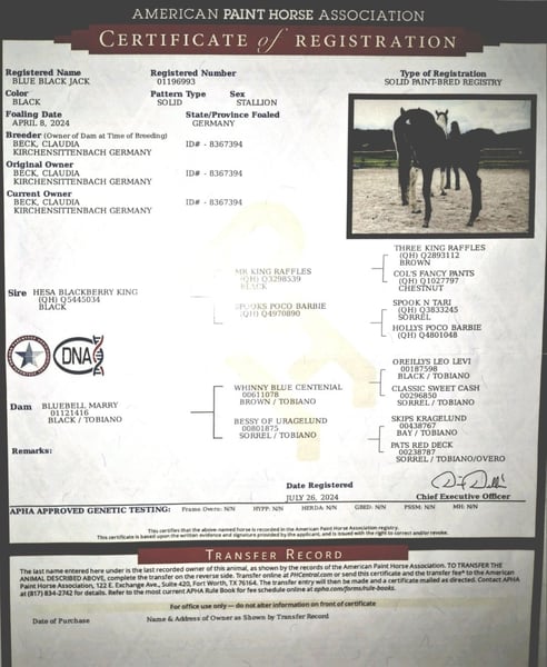 Jack is a 1.5-year-old solid Paint Horse gelding, born and raised with us. He is now looking for a new owner who wishes to support his further training. Jack is friendly, affectionate, and well-balanced in his demeanor, always attentive and eager to learn. He is familiar with all the basic groundwork expected of a young horse at this age, including grooming, hoof handling, traffic exposure, lunging, leading, and loading. Currently, Jack lives in a small mixed herd in an open stable, but he is also accustomed to box stall housing. An ideal young horse for anyone seeking a calm, uncomplicated partner.