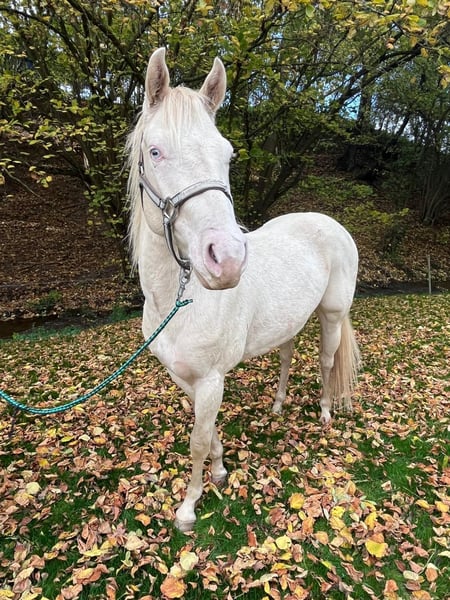 Jack Pine Forever is a healthy, well-built Paint Horse gelding, born on March 31, 2023, featuring a rare smoky cream solid coat with striking blue eyes — truly a head-turner! With an approximate height of 14.7 hands, he displays a harmonious, muscular build that is robust and perfectly proportioned. His temperament makes him truly special: friendly, affectionate, and people-oriented, he has been gentle and eager to learn from the start. Well-behaved, straightforward, and attentive in handling, he is accustomed to vet and farrier visits, regularly wormed, and familiar with both open stall and pasture turnout. Jack Pine Forever already knows the basics of foal training and is being gently lunged, making him an ideal young horse for someone interested in self-education and further training. His solid all-round pedigree, 5-Panel n/n status through his parents, and full Paint Horse registration make him a versatile leisure partner who will bring joy in many disciplines later on. This cool young horse combines health, character, and beauty — perfect for anyone seeking a reliable, eager learner with striking looks. Jack Pine Forever is ready to grow and shine together with his new owner!