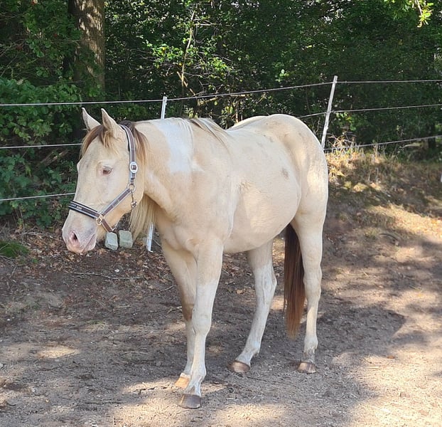 Sehr netter, aufgeschlossener Paint Horse Wallach in der Farbe Champagne Dun Tobiano sucht auf diesem Wege ein neues Zuhause. Er ist in 04/2022 geboren, sein Stockmaß beträgt zz. 1,50m, 5 Panel N/N. Noch nicht geritten, da er sich in Ruhe entwickeln durfte. Er kennt Spaziergänge, Autos, Trecker, Kühe und Schafe. Im Offenstall aufgewachsen, gut sozialisiert und rangniedrig. Ein liebenswerter Kerl, der sehr am Menschen interessiert ist und gern bespasst wird. Aus persönlichen Gründen nur in beste Hände, kein Notverkauf.