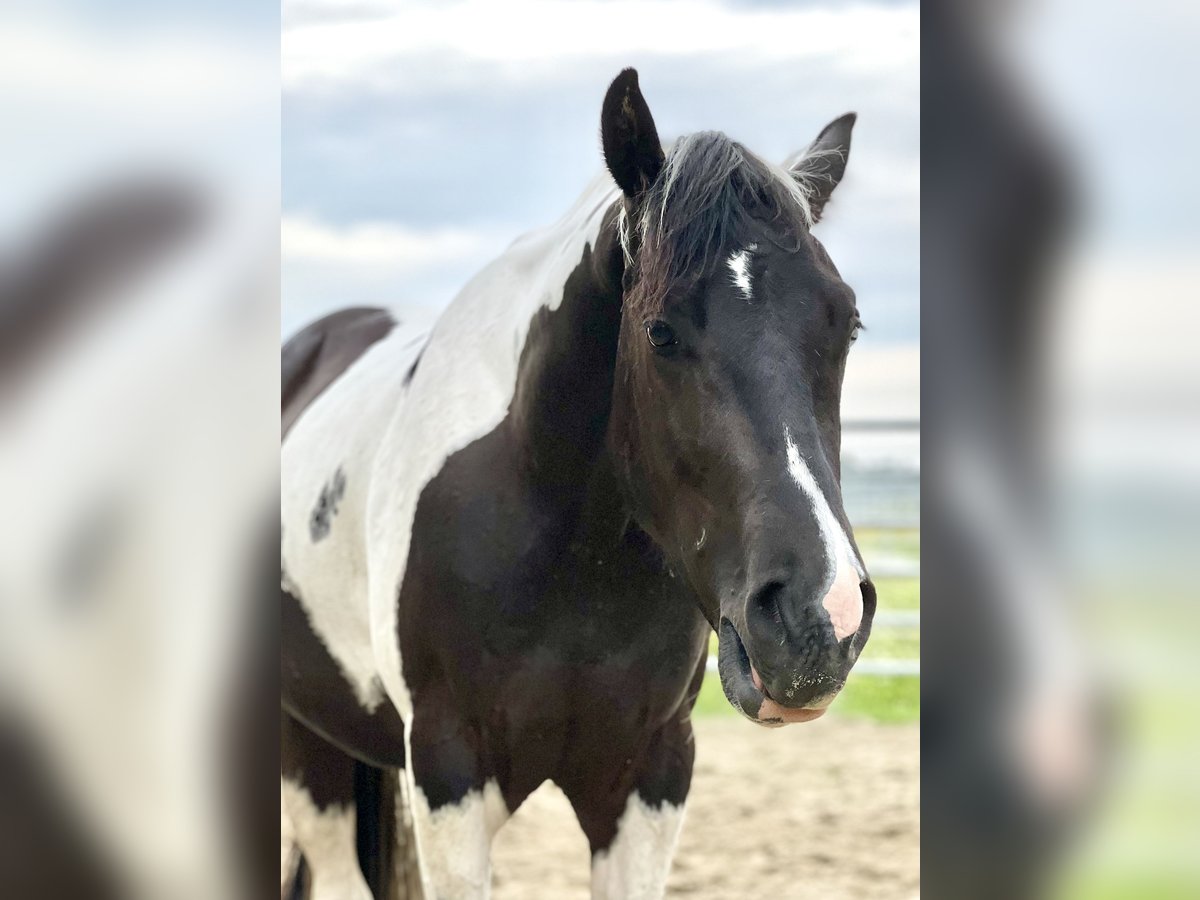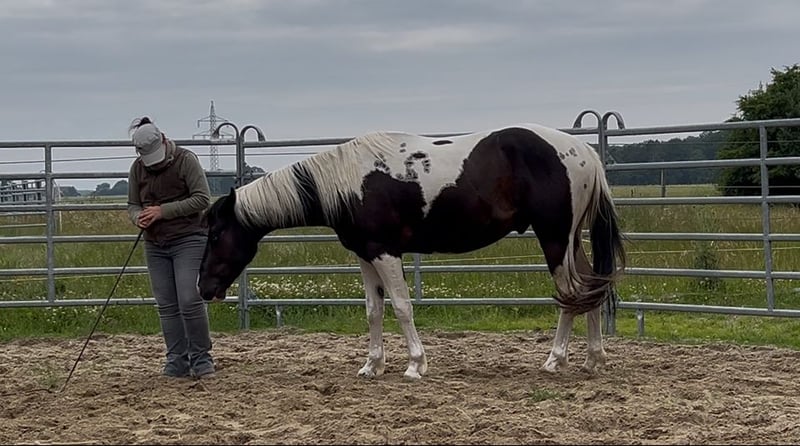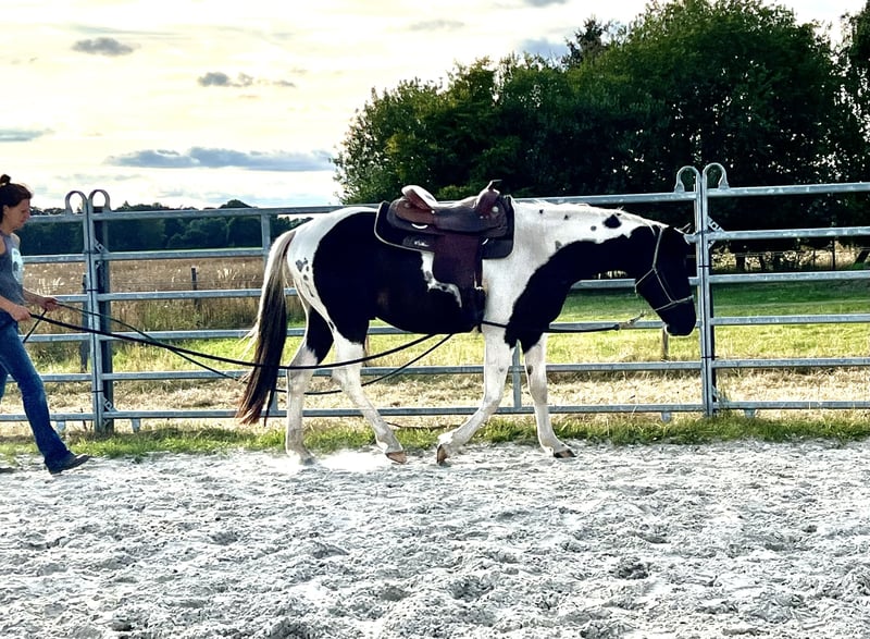 Nics Blueberry Gun – a cuddly, eye-catching gelding with an expressive gaze, a relaxed, “cool” demeanor, and his unmistakable black-and-white coat. Born on April 26, 2022, this American Paint Horse gelding impresses not only visually but also has the potential to become a loving, reliable partner for teenagers and families who value safety, trust, and shared learning successes. Blue is currently approximately 15.2 hh tall and a black-and-white Tobiano with many small spots. His eyes are particularly striking – one blue, one dark. His sire is Dancers Smokin Gun. His pedigree includes well-known and proven Quarter Horse and Paint Horse bloodlines, such as Nics Peppy Train, Shotgunner, Doc O’Mount, Doc Chex, Little Pep Olena, and Dancing Snow Boy. As breeders, we have always prioritized giving our horses time for healthy physical and mental development rather than quick, cheap “training.” Blueberry has been handled from the start according to the principles of Natural Horsemanship. In February 2025, systematic ground work began with an NHS trainer. Building on this, since November 2025, he has been gently under saddle trained by a Parelli instructor and Horse Development Specialist. Throughout, Blueberry sets the pace himself. He accepts new content calmly, trustingly, and without resistance or stress reactions. His training is characterized by calmness, clarity, and subtle communication. Thanks to his honest and relaxed nature, he is very well suited for further training by his new owner. With prior arrangement, additional guidance from our trainer can also be provided. His calm demeanor makes him a pleasant partner in daily handling. Due to this character, he is also suitable for a teenager, provided they are supported and guided, making him an ideal family horse for those who prioritize safety, trust, and a harmonious relationship with their horse. In the future, Blueberry can serve as a reliable leisure partner or be developed further for competitive sport, depending on the wishes and goals of his future owners. We are looking for a home that will continue his gentle training and progress with patience, respect, and joy in shared development. Further videos and photos available. Please provide a telephone contact.