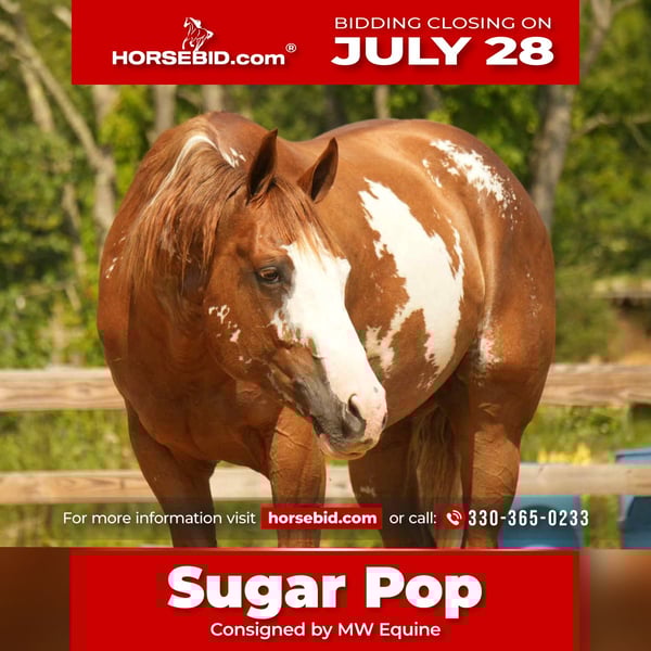 ⚔️ The HORSEMAN's Select ⚔️ Happening now thru MONDAY | JULY 28th - Available EXCLUSIVELY on HorseBid's website! For more details and to register visit: www.Horsebid.com CONSIGNOR CONTACT: MW Equine 330-365-0233 LOCATION: Fresno, OH BREED: APHA REGISTERED: Yes REGISTERED NAME: Sonshine Sugar Pop COLOR: Sorrel Overo HEIGHT: 15.2 AGE: 4 GENDER: Gelding Sugar Pop is a 4 year old registered APHA gelding standing 15.2 hands high. Sugar Pop is the epitome of luxury and class! He is an absolute gem in every way, and a very rare find. You will stand out in any place with this horse! He is a jack of all trades with looks, brains, incredible presence, and a canter like no other! When this horse comes in the ring he outshines everyone else, every time. Whether you want to bring home top ribbons in the hunter ring, or have the most show stopping horse on the trail, you will have a reliable and smart partner to do any job with. In the ring, Sugar Pop rides English & western. Under saddle, he is uncomplicated and reliable. He will pick himself up, collect and ride with contact in the bridle, and naturally carries himself nicely on a loose rein. He has clean, easy canter departures and transitions, is soft in the bridle, works well off your leg and seat, and will move out or collect when asked. Put together a dressage test, practice working equitation type of drills, or just enjoy a well rounded and naturally talented horse on a hack around the barn. On the trails, Sugar Pop is reliable and brave. He is the center of attention out on hunter paces, and he knows he’s handsome because he really does pose for the camera! Sugar Pop crosses water, is traffic safe, and is sure footed on any terrain. We have taken Sugar Pop off property to lots of new places. He’s a blast on the trails, and super smart with his feet on the obstacle course. In the barn, Sugar Pop is sweet and loves to be your buddy . In the barn he is super sweet and loves attention.. He is always the first to meet you at the gate.. He is a gentleman to groom and tack, and absolutely loves attention! He is an easy keeper that’s happy living out - but is a good boy when stalled as well. He requires no maintenance and has no vices. He is super clean and Current PPE on file Sugar Pop is the type of horse you look forward to riding every day. After a long stressful day, I look forward to taking him out to the field and cantering around. He is extremely intelligent, very easy to work with, and honest as the day is long. He shows a lot of promise in many different disciplines, and could go on to be successful in hunter pace , working equitation, and ranch versatility. Though he is just as happy and safe to be a husband horse or trail partner. ♦️ Super solid, Safe, and No Vices ♦️Clean recent vetting on file ♦️Our program produces versatile and family-friendly horses for all disciplines and levels of the sport. While at our farm, every horse is handled, ridden, and loved by us and the kids. ♦️Come and meet him at our farm in Fresno, Ohio. You can also call, or text, Marcus@ 330-365-0233 with any questions.