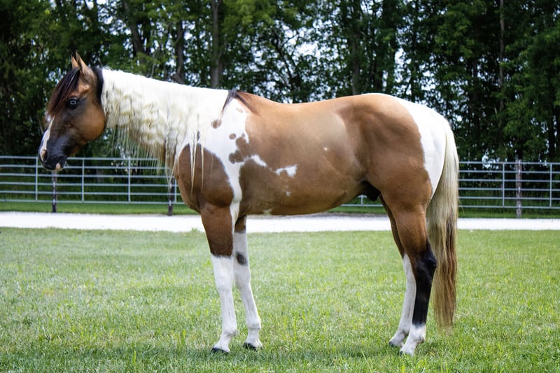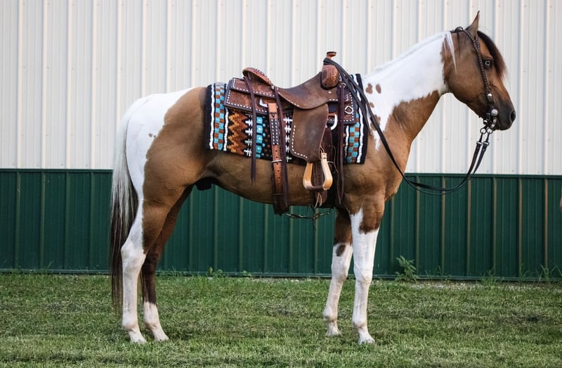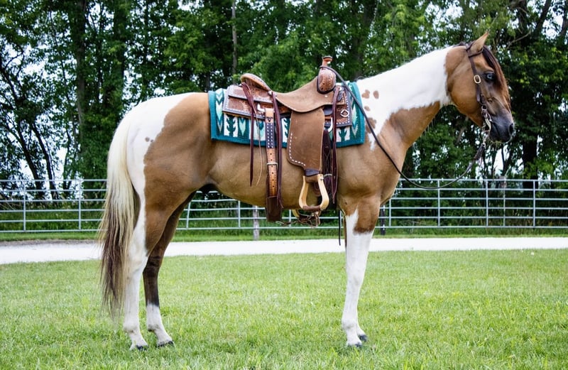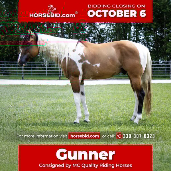 🍂 𝓐𝓾𝓽𝓾𝓶𝓷 𝑨𝑳𝑳 𝑺𝑻𝑨𝑹 𝑳𝑰𝑵𝑬𝑼𝑷 🍂 Happening now thru MONDAY | OCTOBER 6th - Available EXCLUSIVELY on HorseBid's website! For more details and to register visit: www.Horsebid.com CONSIGNOR CONTACT: MC Quality Riding Horses 330-307-0323 LOCATION: Battle Creek, IA BREED: Paint REGISTERED: No REGISTERED NAME: Gunner COLOR: Dunskin HEIGHT: 14.2 AGE: 5 GENDER: Gelding If you are looking for an iconic, unique, memorable Icon, to be staple part of your family for many years to come – don’t miss out on Gunner. Broke, honest, and reliable are the first words that come to mind when I think about… Gunner! He is THE horse we’ve all dreamed about owning since we were kids. He catches the eye of everyone who sees him, and for good reason… This GORGEOUS gelding stands at 14.3 hands and at 5 years old – he has his whole life ahead of him to enjoy with someone. He is a GENTLE soul. Gunner is a one of a kind gelding who is phenomenal in so many ways – has the personality of a giant puppy dog, is the PRETTIEST horse standing in our barn, and he rides around gentle for absolutely anyone. even for the most inexperienced riders. In fact, he has been ridden by small, beginner children with the utmost patience. If you can hold the reins you can ride this gelding. He will not walk off when you go to get on him, and he is as patient as the day is long. Gunner rides on a loose rein and he responds to light subtle cues and voice commands. He walks, trots, and lopes both directions flawlessly, and transitions into any gait with ease. Gunner stops, backs up, and moves off leg pressure. The KIDS absolutely adore him, and he comes with their stamp of approval. But he is still fun and safe for people of all ages. On the ground Gunner is an absolute gentleman. Gunner patiently stands to be groomed, bathed, saddled, and loved on! On top of being enjoyed in the arena Gunner loves to go out on trail rides!. Everyone in town was in complete awe when they saw such a stunning horse riding through the streets & sidewalks with such willingness!! Gunner has been ridden through the most rigorous of trails that around here has to offer. He will go anywhere you point him stepping through water, over rocks and logs, up hills, and other things of the sort. This horse is truly one of a kind. He’s accustomed to machinery, wildlife, dogs, goats, kids, flags, tarps, loud noises etc. Gunner rides perfect alone or will lead or follow in a group out on trails. He loves water and will go right into the crick. He is very sure footed and knows right where his feet are. He will only go as fast as you ask him and will just cruise along slow and steady. Gunner is the most comfortable to ride and you can enjoy him all day. Gunner has been introduced to obstacles and performed well. He has been roped on the ranch/pasture and has experience gathering cattle in the hills. If you are looking for a horse that you can pull up and ride once a week or once a month, Gunner is your guy! Trustworthy and safe every time you saddle him up. Gunner isn’t just a horse - he’s a once in a lifetime partner for someone who wants safety, reliability, and a big heart. Horses like him don’t come around often! If you have any questions, concerns, please call/text at (330) 307-0323 . If you have any questions regarding transport, please reach out! I am more than happy to assist in setting up dependable shipping no matter where you are. We work side by side with numerous SAFE, tried and true, reliable, affordable transporters, so you can have complete peace of mind knowing your new best friend will safely arrive at your doorstep!