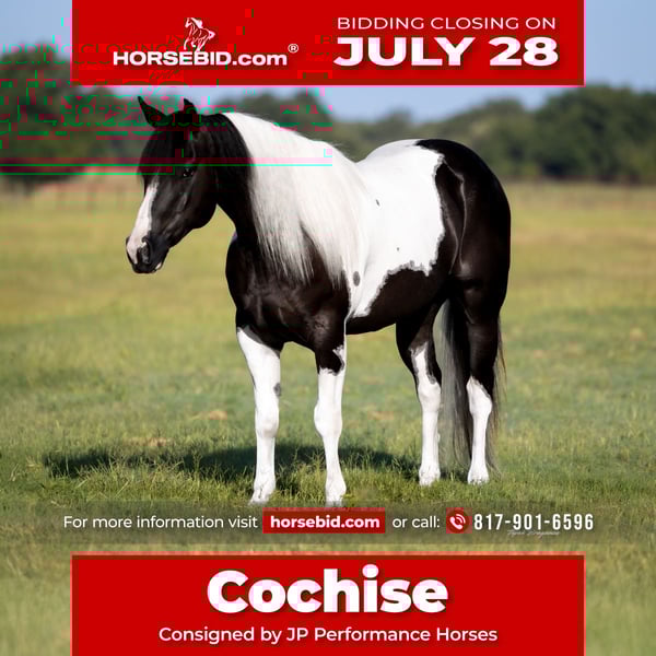 ⚔️ The HORSEMAN's Select ⚔️ Happening now thru MONDAY | JULY 28th - Available EXCLUSIVELY on HorseBid's website! For more details and to register visit: www.Horsebid.com CONSIGNOR CONTACT: JP Performance Horses 817-901-6596 LOCATION: Weatherford, TX BREED: Paint REGISTERED: No COLOR: Black and White HEIGHT: 14.2 AGE: 6 GENDER: Gelding Cochise is a true black and white paint gelding standing 14.2 hands and absolutely the sweetest horse in our barn. His striking looks will turn heads wherever you take him. But he’s not just a pretty face— at the young age of 6, Cochise is the total package when it comes to rideability, versatility, and personality. We have used him for photo shoots with name brand companies to letting beginner camera crew ride him for podcast. He truly is one of those horses you can throw anyone on and trust he will take care of them. He is super broke to ride and gentle every single day. Whether you're saddling him up for arena work or heading out on the trail, he’s always consistent and reliable. Cochise catches both leads with ease, has a smooth lope, a solid stop, and an incredibly comfortable slow jog. He moves off leg pressure, has a clean one-handed turnaround, and an overall soft feel. Cochise has been ridden everywhere—from trails, along highways, in the Brazos River, even through town—and he handles it all with confidence and grace. He’s sure-footed, unfazed by commotion, and has a calm, trainable mind. He is a lover. Meets you at the gate, loves bath time, wants to be your BEST FRIEND. He has all the tools to be a standout in ranch work, roping, showing—you name it. The possibilities are endless with this talented young gelding. If you’re looking for a well-rounded horse that the WHOLE family can enjoy for years to come, Cochise is the one. Don’t miss this exceptional opportunity! Call Jackie at JP Performance Horses at 817-901-6596 to schedule a time to meet Cochise or chat about him. Shipping can be arranged anywhere.