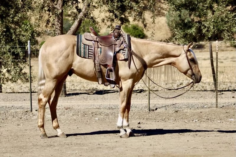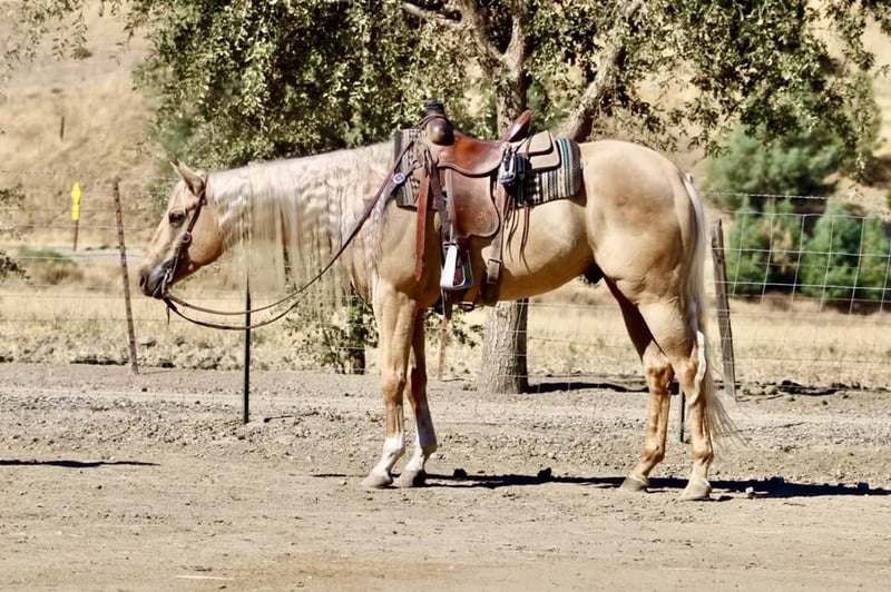 ONLINE AUCTION Place your bids at www.PlatinumEquineAuction.com Starting Bid $3500 Auction ends October 13th, 2024 Need a new saddle? Check out White Rock Saddles on our website or Facebook! Longhorn Ranch is proud to present I’m A Smooth Trigger aka Trigger , a stunning APHA 15.2 hand 2020 palomino gelding whose long, lustrous mane flows like golden silk in the breeze. If you’ve been searching for that perfect horse to complement your adventures, look no further Trigger has a gentle nature and playful personality, he’s not just easy to be around; he’s also a reliable companion whether you’re on the ranch gathering cows or navigating through diverse terrains. His smooth gaits make every ride a pleasure as he transitions effortlessly from trot to canter and back again with an elegant collected headset that speaks volumes of his training. Imagine him strutting proudly in English tack at the arena or trotting along scenic trails you’ll see heads turn wherever you go! And let’s not forget about his potential; with those graceful strides and calm disposition, who knows? He could even shine as a barrel horse if you’re feeling adventurous! Trigger adapts beautifully to any environment, making him suitable for both pasture life and stall living while handling time off like a champ. In busy traffic situations or alongside pedestrians, he remains unflappable cars and semis are nothing but passing sights to this impressive boy. So if you’re looking for that long-term partner who embodies both poise and charm in equal measure, Trigger is absolutely your man. He hauls great easy to clip tie and bath. Please contact Longhorn Ranch Dina 831-537-1915 Located in Paicines, CA. ONLINE AUCTION Place your bids at www.PlatinumEquineAuction.com Starting Bid $3500 Auction ends October 13th, 2024 Need a new saddle? Check out White Rock Saddles on our website or Facebook!