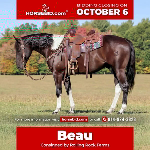 CONSIGNOR CONTACT: Rolling Rock Farms 814-924-3828 LOCATION: Miola PA BREED: Paint REGISTERED: Yes REGISTERED NAME: DB BEAU MITZI COLOR: Black paint HEIGHT: 15.2 AGE: 6 GENDER: Gelding Beau is the kind of horse you can count on day in and day out. He is a true gentleman, at just six years old he already rides like a seasoned veteran, making him a wonderful partner for riders who want a dependable horse they can enjoy for years to come. From the moment you walk into the barn he is friendly and easy to catch whether he has been in a stall or turned out in the pasture. He stands quietly to be brushed, saddled, and bathed and he loads and hauls good and without a fuss. On the trail Beau is simply outstanding. He will ride out all day on a loose rein, happy to travel in a group or head out alone. He has been exposed to dogs, farm equipment, and every sort of country terrain and nothing seems to bother him. Water crossings, wooded trails, open fields, or rocky hillsides, Beau steps through or over it all with confidence and surefooted ease. Whether you are looking for a weekend trail companion or a partner for long adventurous rides he is the kind of horse that makes the journey relaxing and fun. Beau’s talents do not stop at the trail. In the arena he is solidly broke and responsive with a true one hand neck rein, smooth lope, and the ability to lope off and catch both leads with ease. Will side pass, and offers a big deep stop. Beau is comfortable bareback and bridleless, has been roped off of, and will even carry the American flag with confidence. Thanks to his gentle nature and training Beau would be a perfect match for a confident beginner looking for a step up horse as well as riders who simply want a trustworthy versatile gelding. He is the same horse every time you ride even after time off and always saddles up and rides off like a pro. Beau sells with a current negative Coggins and a rabies vaccination so he is ready to travel and settle into his new home right away. Horses like Beau, young, well mannered, and already this seasoned, are hard to find. For questions or to arrange a time to meet this exceptional gelding please contact Ethan Shultz at (814) 924-3828.