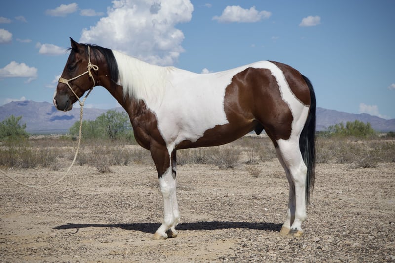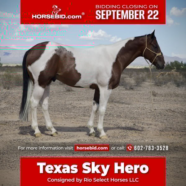 🍁𝒕𝒉𝒆 𝐅𝐀𝐋𝐋 𝑺𝒑𝒆𝒄𝒕𝒂𝒄𝒖𝒍𝒂𝒓🍁 Happening now thru MONDAY | SEPTEMBER 22nd - Available EXCLUSIVELY on HorseBid's website! For more details and to register visit: www.Horsebid.com CONSIGNOR CONTACT: Rio Select Horses LLC 602-7833528 LOCATION: Tonopah, AZ BREED: APHA REGISTERED: Yes REGISTERED NAME: Texas Sky Hero COLOR: Tobiano Paint HEIGHT: 15.3 AGE: 6 GENDER: Gelding Gentle 6 year old Gelding, all around family ranch horse with a solid reining foundation and a ton of potential to go further in the arena . Wrangler is reliable for nearly any rider , athletic , excels as a solid trail horse ( solo or in a group) , sound, healthy and easy to handle. Wrangler has fancy spins with a big stop. He neck reins and easy to move off his legs, He is good with kids and respectful to his riders. Wrangler is level headed , kind and willing. He is ready to be someone’s best friend with a kind eye and a loving attitude! He has been used to gather cattle and knows his way around ranch work. Wrangler stands for farrier , bathing, grooming and mounting block . He loads effortlessly and travels well.