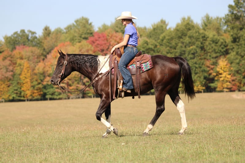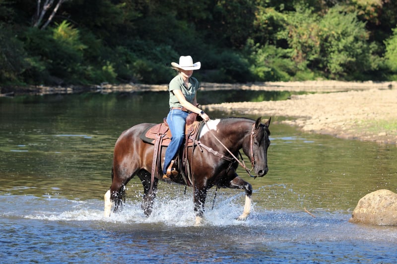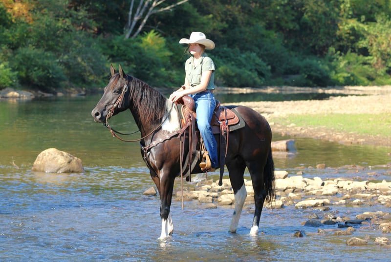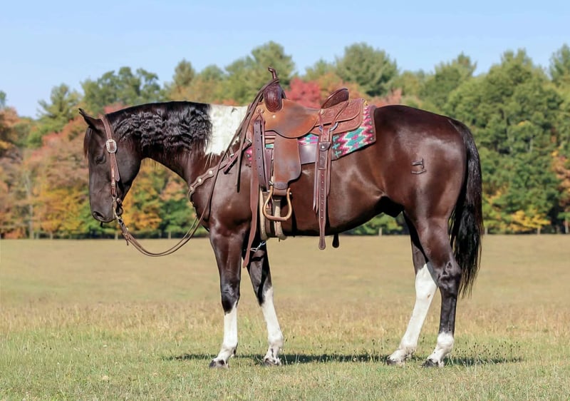 CONSIGNOR CONTACT: Rolling Rock Farms 814-924-3828 LOCATION: Miola PA BREED: Paint REGISTERED: Yes REGISTERED NAME: DB BEAU MITZI COLOR: Black paint HEIGHT: 15.2 AGE: 6 GENDER: Gelding Beau is the kind of horse you can count on day in and day out. He is a true gentleman, at just six years old he already rides like a seasoned veteran, making him a wonderful partner for riders who want a dependable horse they can enjoy for years to come. From the moment you walk into the barn he is friendly and easy to catch whether he has been in a stall or turned out in the pasture. He stands quietly to be brushed, saddled, and bathed and he loads and hauls good and without a fuss. On the trail Beau is simply outstanding. He will ride out all day on a loose rein, happy to travel in a group or head out alone. He has been exposed to dogs, farm equipment, and every sort of country terrain and nothing seems to bother him. Water crossings, wooded trails, open fields, or rocky hillsides, Beau steps through or over it all with confidence and surefooted ease. Whether you are looking for a weekend trail companion or a partner for long adventurous rides he is the kind of horse that makes the journey relaxing and fun. Beau’s talents do not stop at the trail. In the arena he is solidly broke and responsive with a true one hand neck rein, smooth lope, and the ability to lope off and catch both leads with ease. Will side pass, and offers a big deep stop. Beau is comfortable bareback and bridleless, has been roped off of, and will even carry the American flag with confidence. Thanks to his gentle nature and training Beau would be a perfect match for a confident beginner looking for a step up horse as well as riders who simply want a trustworthy versatile gelding. He is the same horse every time you ride even after time off and always saddles up and rides off like a pro. Beau sells with a current negative Coggins and a rabies vaccination so he is ready to travel and settle into his new home right away. Horses like Beau, young, well mannered, and already this seasoned, are hard to find. For questions or to arrange a time to meet this exceptional gelding please contact Ethan Shultz at (814) 924-3828.