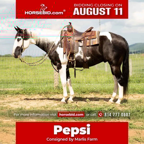 ⚜ The HERITAGE Classic ⚜ Happening now thru MONDAY | AUGUST 11th - Available EXCLUSIVELY on HorseBid's website! For more details and to register visit: www.Horsebid.com CONSIGNOR CONTACT: Marlis Farm 814 777 0607 LOCATION: Rebersburg pa BREED: Paint quarter horse REGISTERED: No REGISTERED NAME: Pepsi COLOR: Black and white HEIGHT: 15.3 AGE: 7 GENDER: Gelding Pepsi as we call him is a 15.3 hand paint quarter horse gelding that is pretty and super gentle!! Pepsi rides well in the arena and out on the trails, he has a smooth, easy walk trot and canter with a good stop. Pepsi is very easy and uncomplicated to ride, he neckreins, sidepasses and moves off leg pressure and always stays quiet and controlled making you feel like your a million dollar rider. Pepsi is gentle enough my little boys can lead, brush and learn to ride on him in the arena. We have taken Pepsi up in the mountains and down the main highway into town and he'll go wherever you point him with no issues. We have also exposed him to flags, bouncy balls and all kinds of obstacles and he doesnt mind any of it. Pepsi also rides english and gets a thrill out of taking a jump. I think Pepsi could excel as an english hunter / jumper or be a lesson horse or just your forever trail partner. He stands to be tacked shod and bathed and to mount and dismount. Pepsi meets you at the gate and loves all the attention you give him. He does well inside or turned out in a mixed herd. Pepsi sells sane, safe, sound and ready to move into his forever home. For more info or to come meet this great gelding call Mark 814 777 0607 We can help arrange shipping nationwide!!