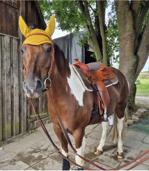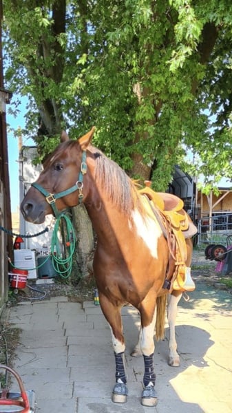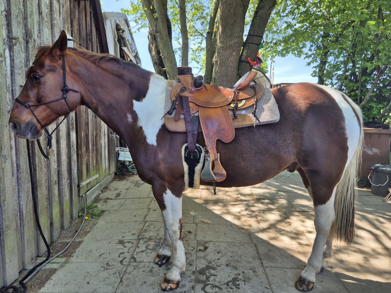 Foundation-bred Paint gelding from 2017 156 cm tall, large hooves, stable joints, older type. Regularly vaccinated and dewormed. Shoeing and loading well-behaved. Annual check-up by the dentist as well as physiotherapy/osteopathy. Familiar with box, paddock, and herd management; has been well-compatible with all and everywhere so far. Whether 4 hours or up to 24 hours of turnout, he has never had any issues. He is shod in all four hooves. In winter, he is blanketed with us. Ridden for leisure. In the last few months, he has only been ridden irregularly due to a lack of time. However, he handles this well; he is not the type to tear apart the box on days off. He has never bucked or bolted, but he does need clear, consistent guidance and is therefore only conditionally suitable for beginners. Not a forced sale; he will only go if the fit is right. Please only serious inquiries where there is genuine interest in purchasing. Also available with his equipment. Price depends on whether with or without equipment.