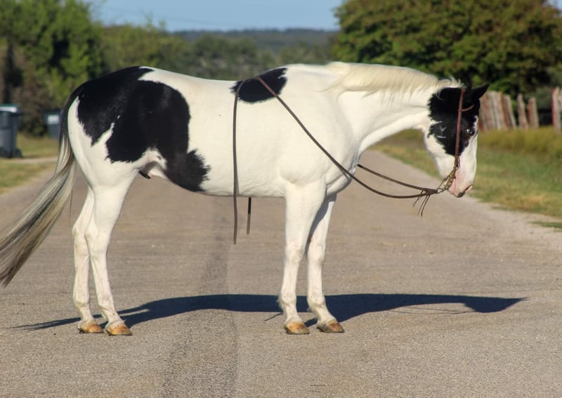 ONLINE AUCTION Place your bids at www.PlatinumEquineAuction.com Starting Bid $3500 Auction ends November 24th, 2024 Need a new saddle? Check out White Rock Saddles on our website or Facebook! Let me introduce to you this GORGEOUS one of a kind gelding known as Captain . He is a 8 year old black and white paint gelding standing 15hds tall. Captain is uniquely marked with blue eyes, a two tone black and white tail . This guy is GORGEOUS and is for sure going to get you noticed wherever you may take him. He has spent most of his young life on a ranch while doing all of the ranch chores , he has roped sick cattle outside, he has seen many many miles out on the ranch gathering and also checking fence. Captain has a awesome little lope to him and he will lope right out of your hand like butter , he is one handed broke, neck reins, moves off your leg , he will walk,trot and lope circles in the arena or out in the open field. He goes down the trail wherever you point him, ride him on the steep mountain trails or out in the flat grasslands he handles it all. Hes user friendly and isn’t complicated to ride at all. Captain is traffic broke he’s been rode down busy hwys, and also down at the Fort Worth Stockyards where he starred in a group of high schoolers school project , he was obviously the STAR of the show!!! And had great patience through it all. He has been rode in rodeo grand entry’s and parades. Everyone loves a gorgeous paint horse , I guarantee you won’t find another one like him!!! Captain will self load into the trailer, he stands tied with patience and no nonsense, stands for the farrier, and loves his bath time. Hes easy to tack up and bridle. Stands to be mounted and also stands for the mounting block. He can be turned out in a herd setting or stalled. Contact us to come try him, or we can set up a FaceTime also. If you need help with transport don’t hesitate to ask we have a list of reputable haulers that can get him safely to your doorstep world wide from Stephenville, TX. Contact M $ Performance Hores Michelle 661-817-9120 with any questions. ONLINE AUCTION Place your bids at www.PlatinumEquineAuction.com Starting Bid $3500 Auction ends November 24th, 2024 Need a new saddle? Check out White Rock Saddles on our website or Facebook!