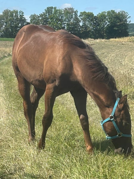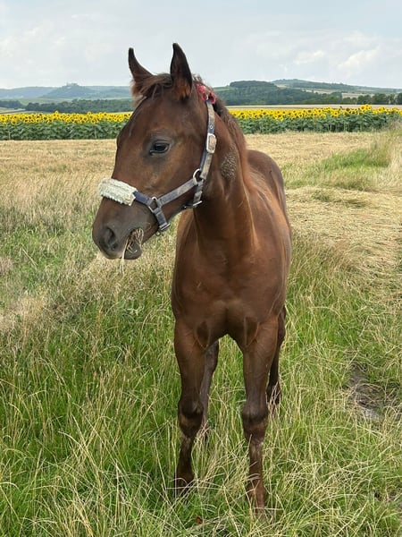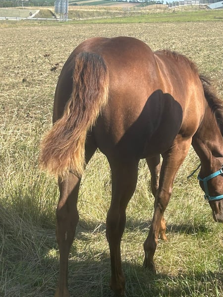 Verkaufe American Quarter Horse Hengst – Dunkelfuchs, Geburtsjahr 2025 Zum Verkauf steht ein vielversprechender American Quarter Horse Hengst, geboren im Jahr 2025. Der kleine Ferdinand präsentiert sich in einem eleganten Dunkelfuchs-Farbton und wird ein geschätzes Stockmaß von ca. 150 cm erreichen. Er hat ein tolles Fundament und ein ausgezeichnetes Wesen, er ist einfach im Umgang und will immer gefallen. Der Hengst zeigt jetzt schon gute Ansätze im Bereich Reining. Ferdinand hat ein sehr aufgeschlossenes freundliches Wesen und lernt sehr schnell. Er ist im Umgang sehr brav. Ferdinand wächst artgerecht im Herdenverband auf und ist sehr sozial. Bei Interesse oder weiteren Fragen stehe ich gerne zur Verfügung. Besichtigungen sind nach Vereinbarung möglich. Bei erstgemeinten Interesse kann über den Preis geredet werden. Wichtig ist mir ein guter artgerechter Platz und ein liebevoller Umgang.