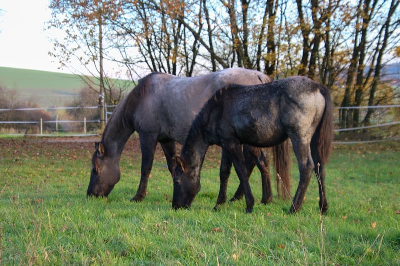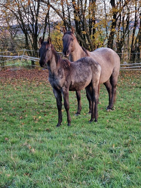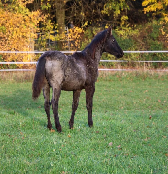 Just Be Blue Sky - dieser bildhübsche Quarter Horse Hengst, geboren am 9.4.2025, beeindruckt in der auffälligen Farbe Blue Roan und wird voraussichtlich ein Endmaß von 150 bis 154 cm bekommen. Homozygot für black und roan. Blue ist über seine Eltern 5-Panel n/n. Er wächst gesund und artgerecht im Herdenverband mit anderen Jungpferden auf. Bei Abgabe wird er entwurmt sein. Kennt dann den Tierarzt und den Hufschmied. Mit seinem lieben Charakter verzaubert er die Umwelt. Ist verschmust sowie cool und erkundigt gerne seine Umwelt. Blue wird täglich gehändelt und benimmt sich dabei brav und unkompliziert. Beim Toben zeigt er jetzt schon seine tollen Bewegungen. Dank seiner guten Allround Abstammung wird er sich voraussichtlich sehr gut für den Sport oder/und als treuen Freizeitbegleiter eignen. Wird mit vollen AQHA Papieren und Equiden Pass abgegeben.